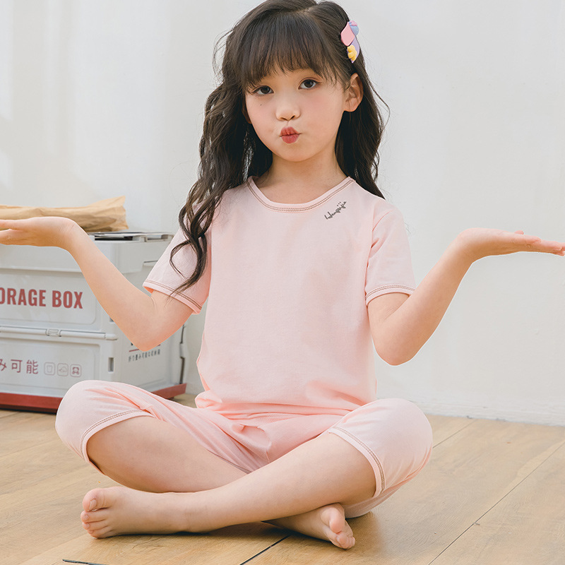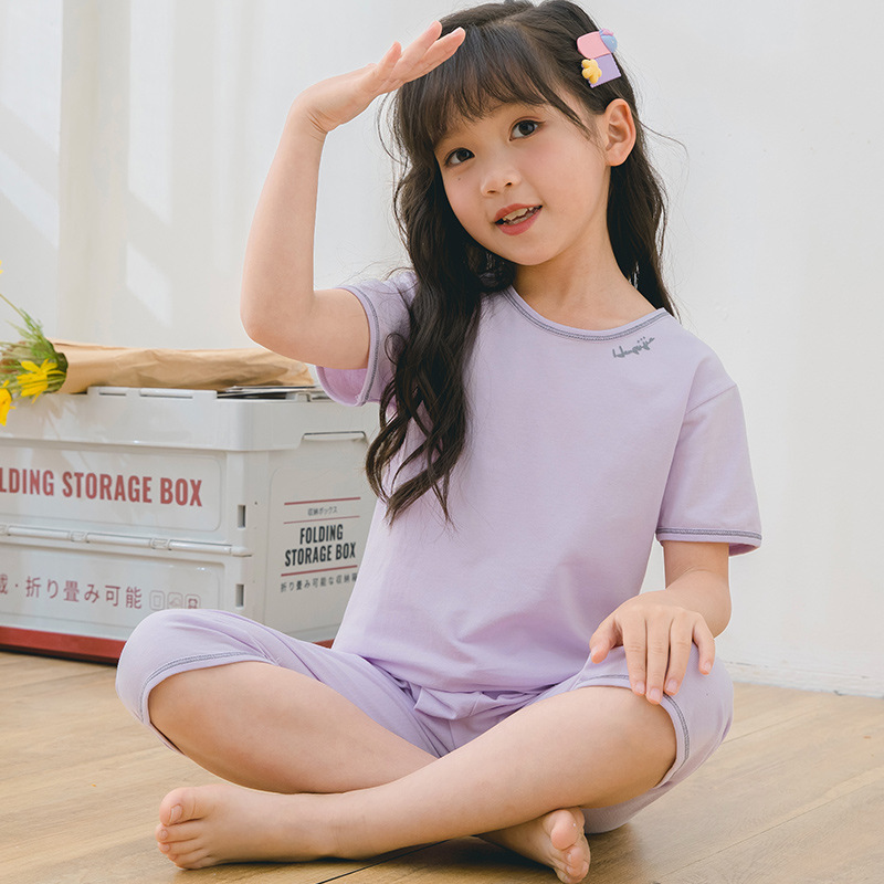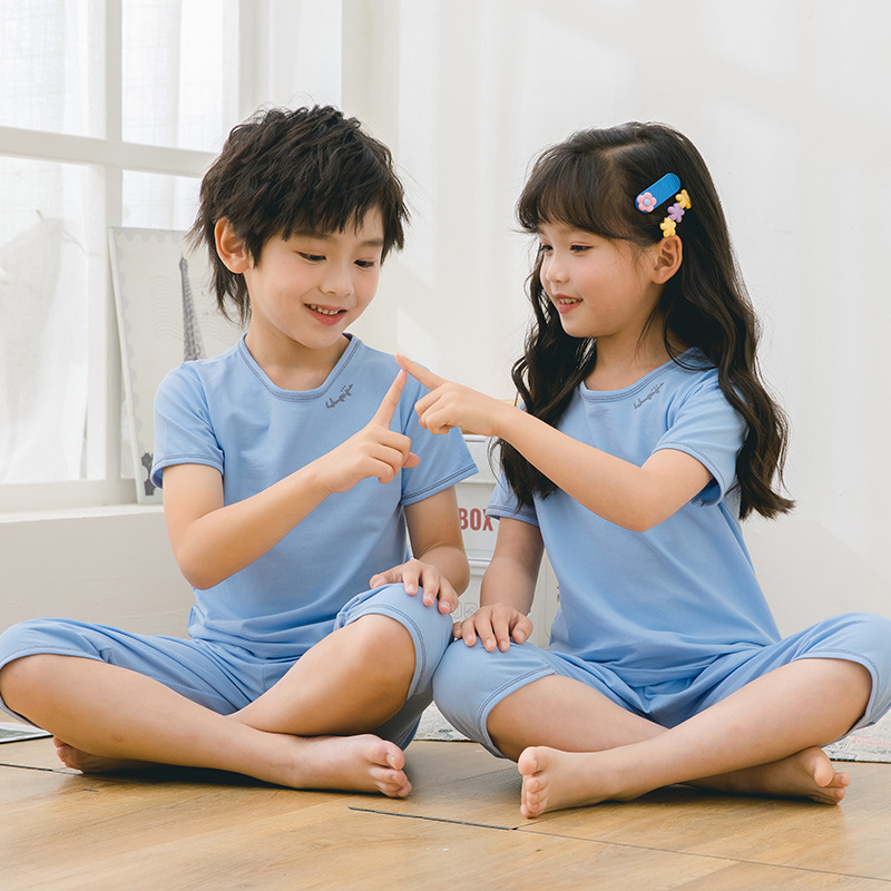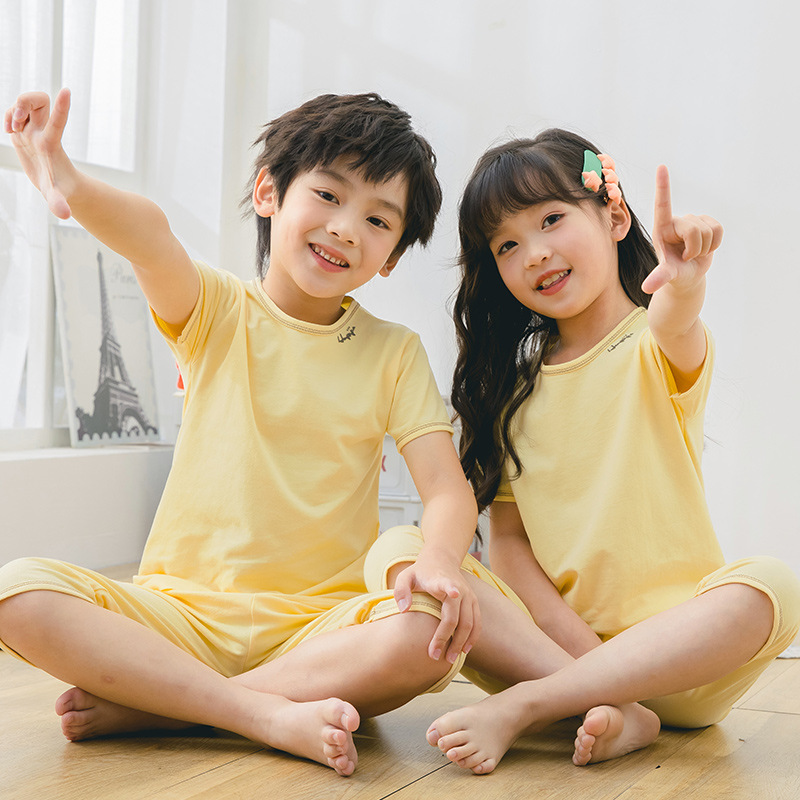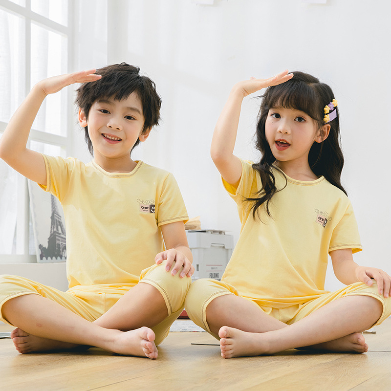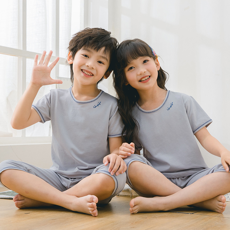 2025 여름 어린이 홈 의류 세트 소년의 순면 파자마 소녀 어린 소년의 짧은 소매 중형 및 대형 어린이 에어컨 옷스토어 가기