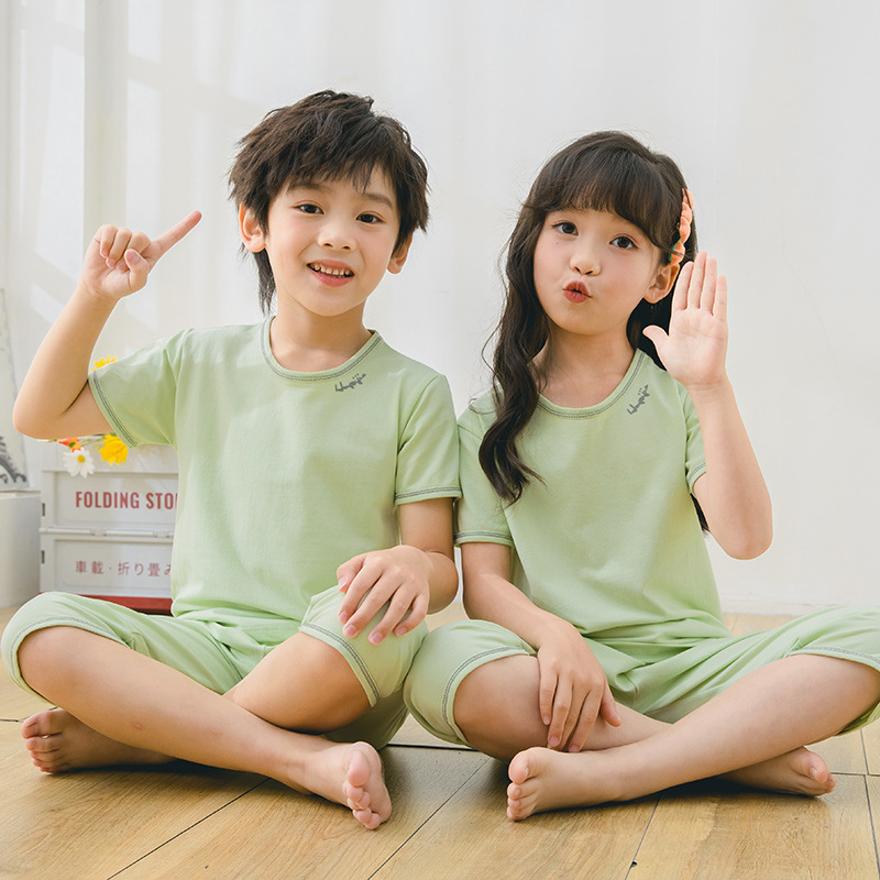 2025 여름 어린이 홈 의류 세트 소년의 순면 파자마 소녀 어린 소년의 짧은 소매 중형 및 대형 어린이 에어컨 옷
