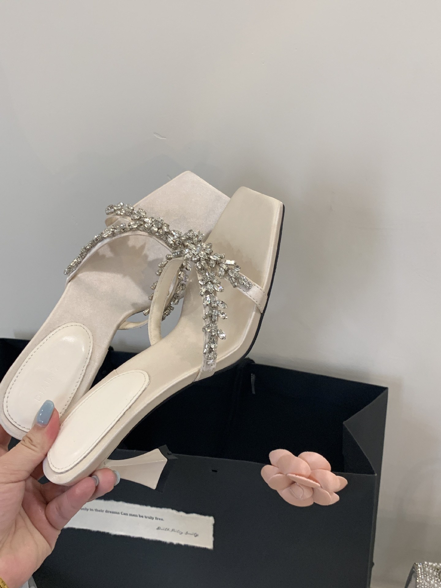 Yangshulin 여름 스퀘어 토 라인스톤 여성용 원 스트랩 샌들, 두꺼운 굽, 오픈 토, 섹시한 크로스 스트랩, 프렌치 새틴 하이힐스토어 가기