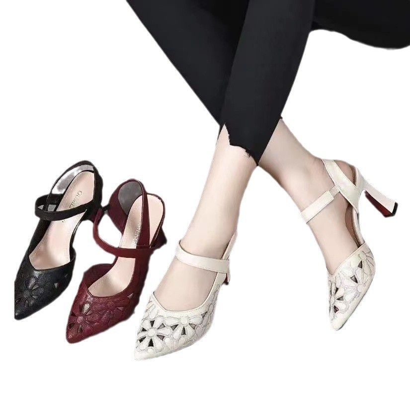 대외 무역 도매 하이힐 샌들 2024 새로운 패션 포인트 샌들 다시 속이 빈 부드러운 가죽 중공 발가락 하이힐 여성스토어 가기