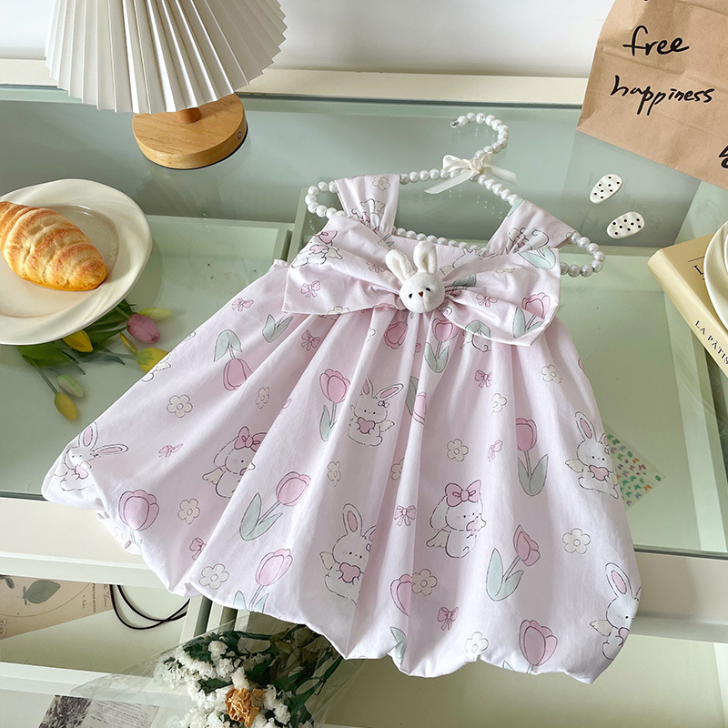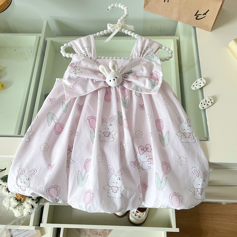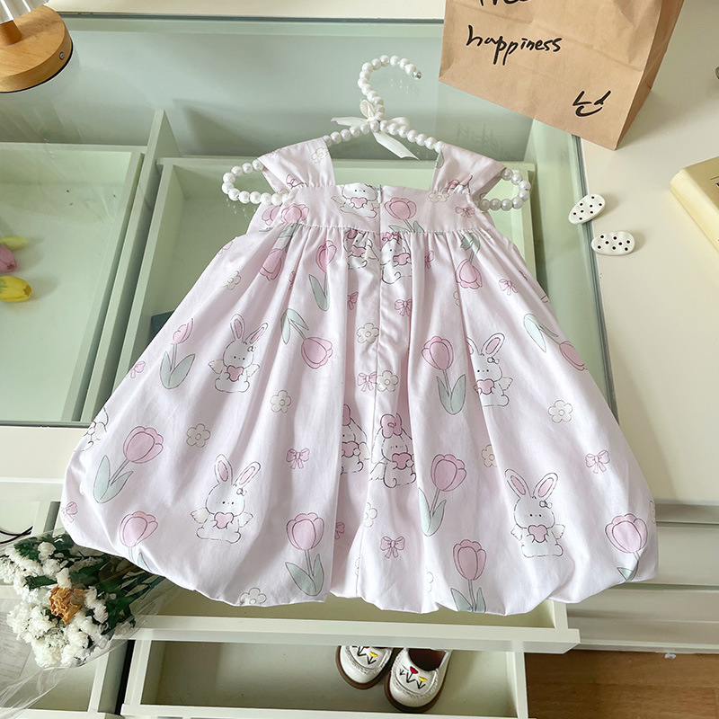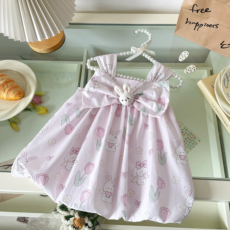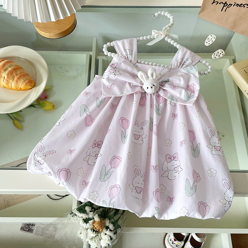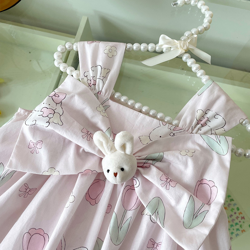 XQ259320 소녀 원피스 2025 여름 새로운 만화 토끼 활 튤립 인쇄 달콤한 원피스