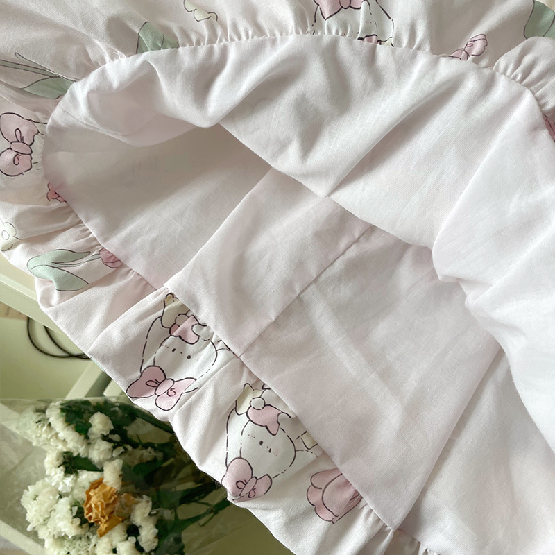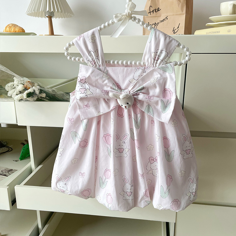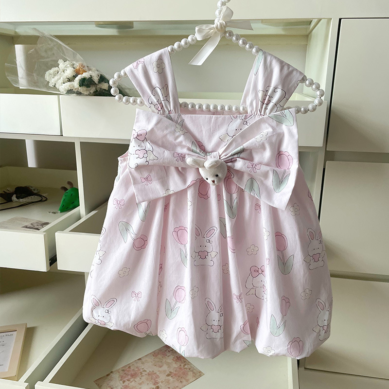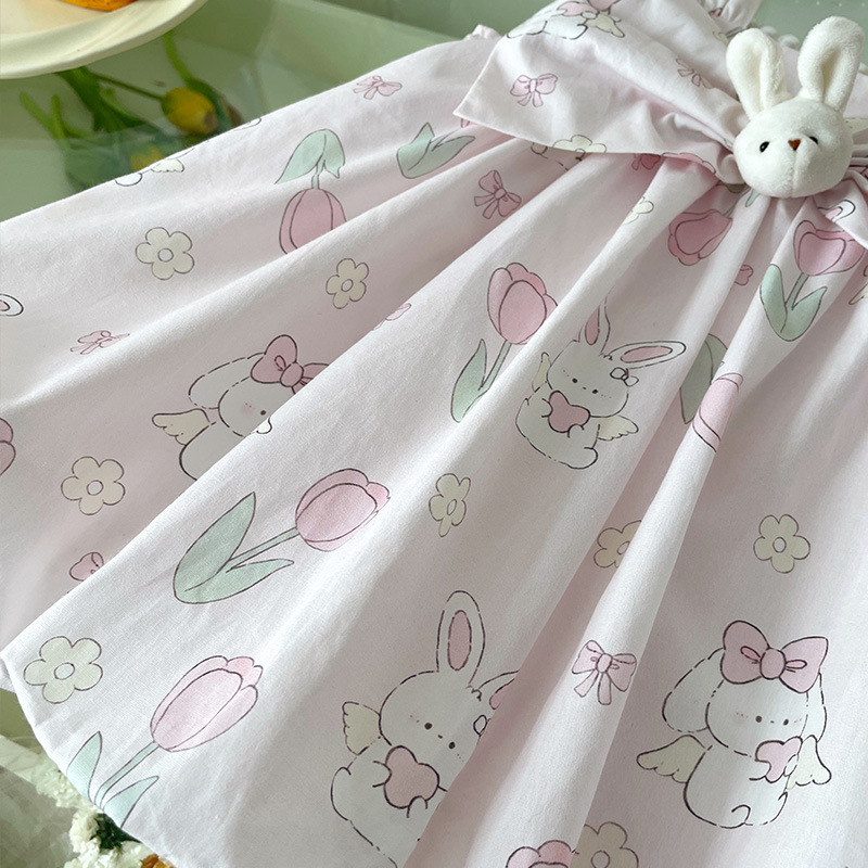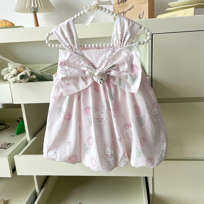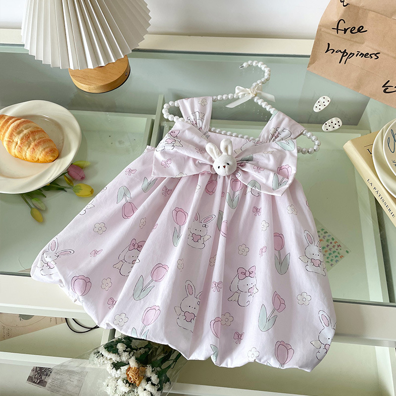 XQ259320 소녀 원피스 2025 여름 새로운 만화 토끼 활 튤립 인쇄 달콤한 원피스