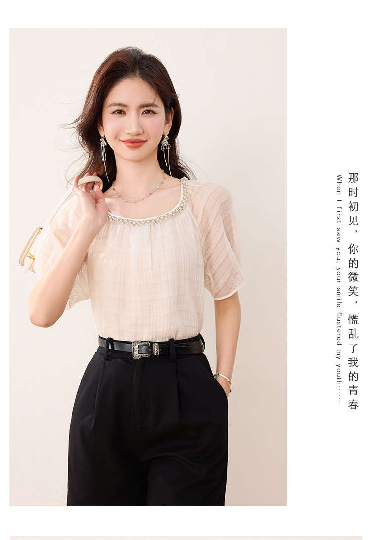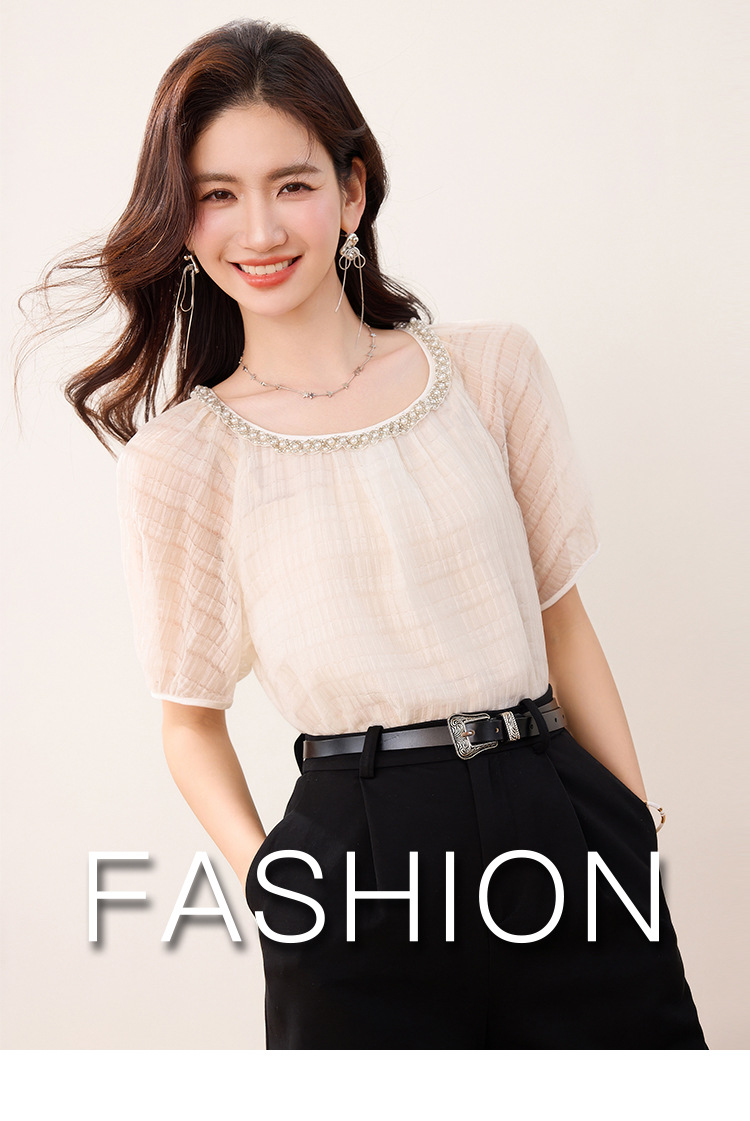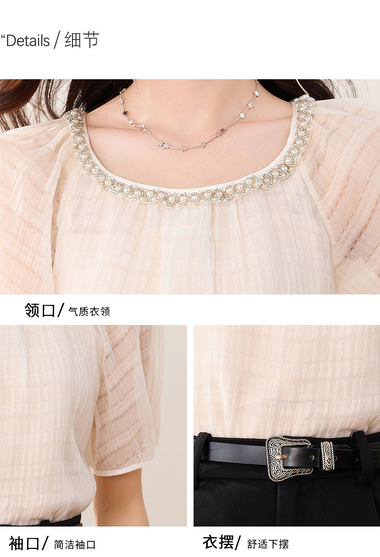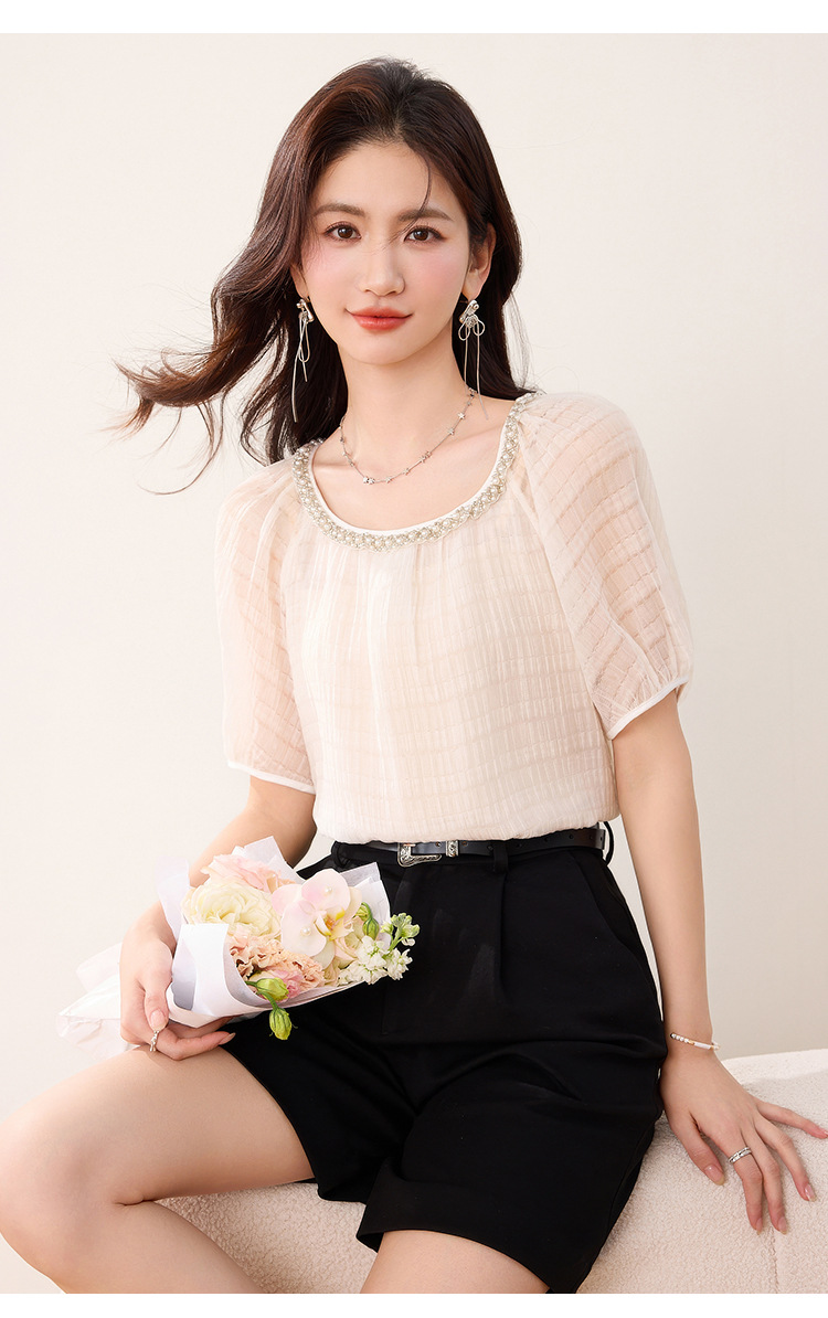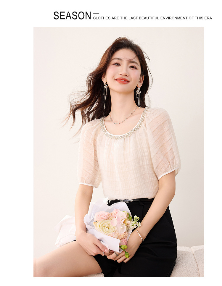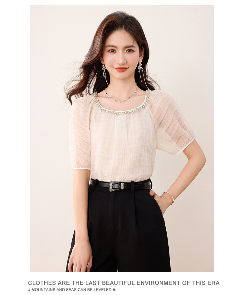 진주 퍼프 슬리브 프랑스 달콤한 반팔 티셔츠 여성 여름 2025 새로운 스타일 작은 우아한 짧은 탑스토어 가기