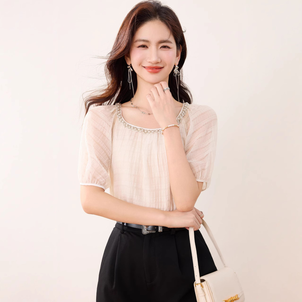 진주 퍼프 슬리브 프랑스 달콤한 반팔 티셔츠 여성 여름 2025 새로운 스타일 작은 우아한 짧은 탑