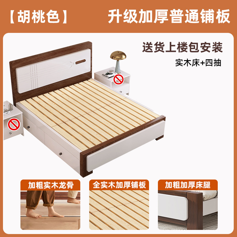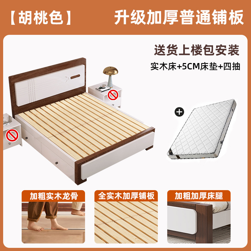 • [월넛 컬러] 원목 침대, 넓고 두꺼워진 침대판 + 5CM 브라운 매트 + 서랍 4개 [위층 패키지 설치]