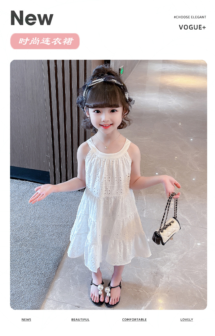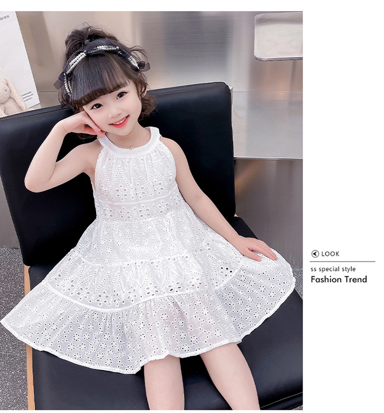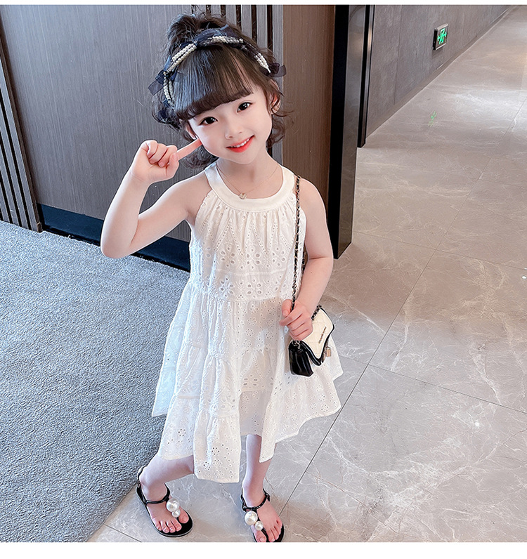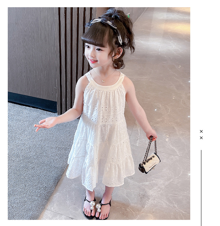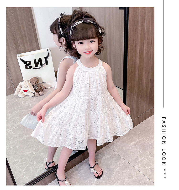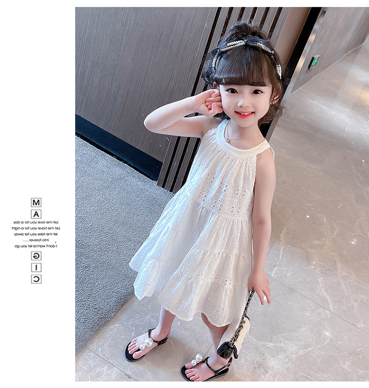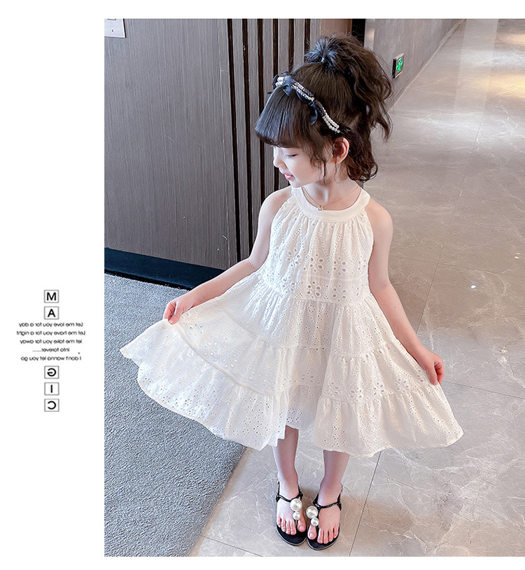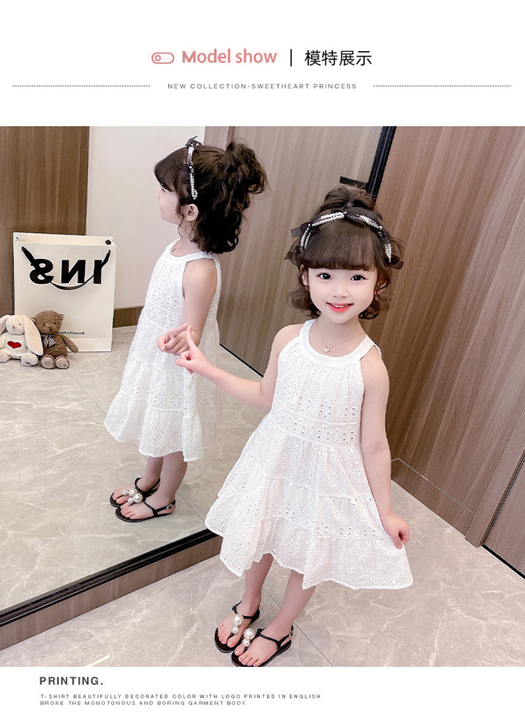 소녀 화이트 자카드 원피스 2025 여름 새 스타일 민소매 레이스 할로우 공주 원피스 어린 소녀스토어 가기