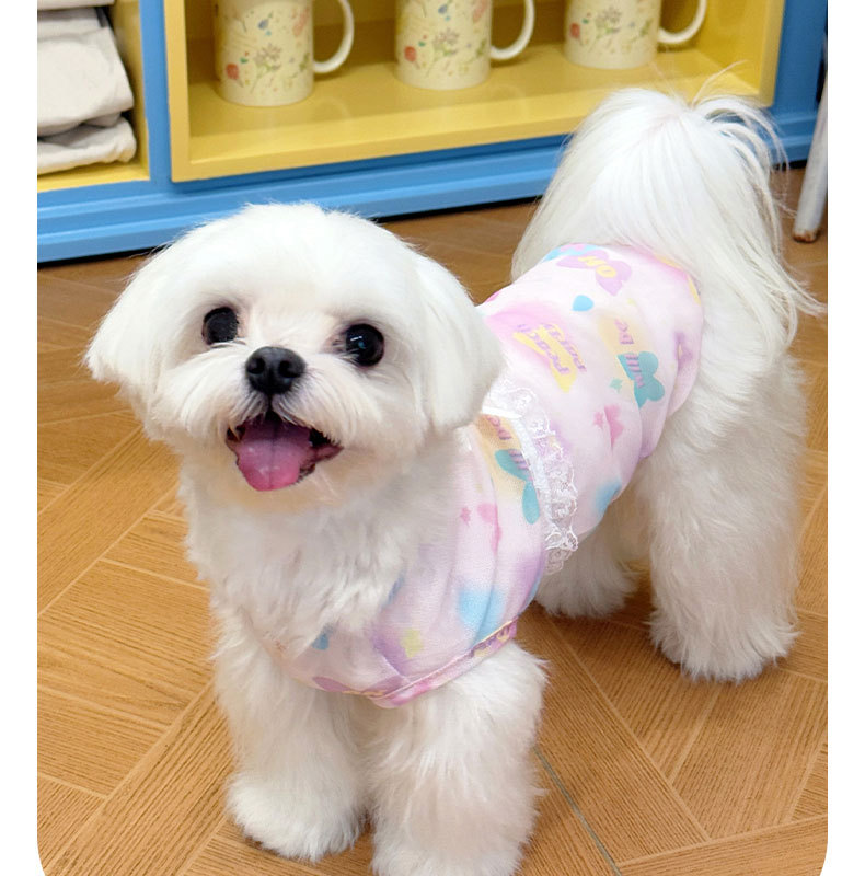 새로운 봄과 여름 핑크 레이스 소매 얇은 통기성 메쉬 여름 귀여운 조끼 애완 동물 강아지 옷 도매스토어 가기