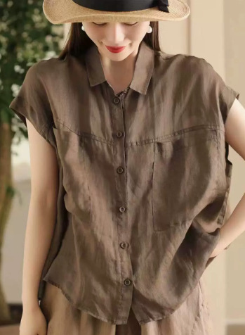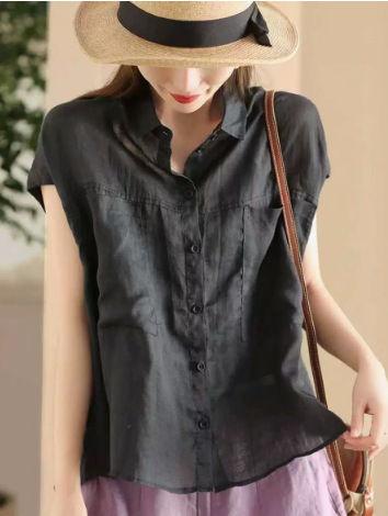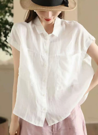 여름 새로운 빈티지 큰 포켓 라미 셔츠 여성의 우아한 옷깃 짧은 소매 셔츠 단색 카디건 탑