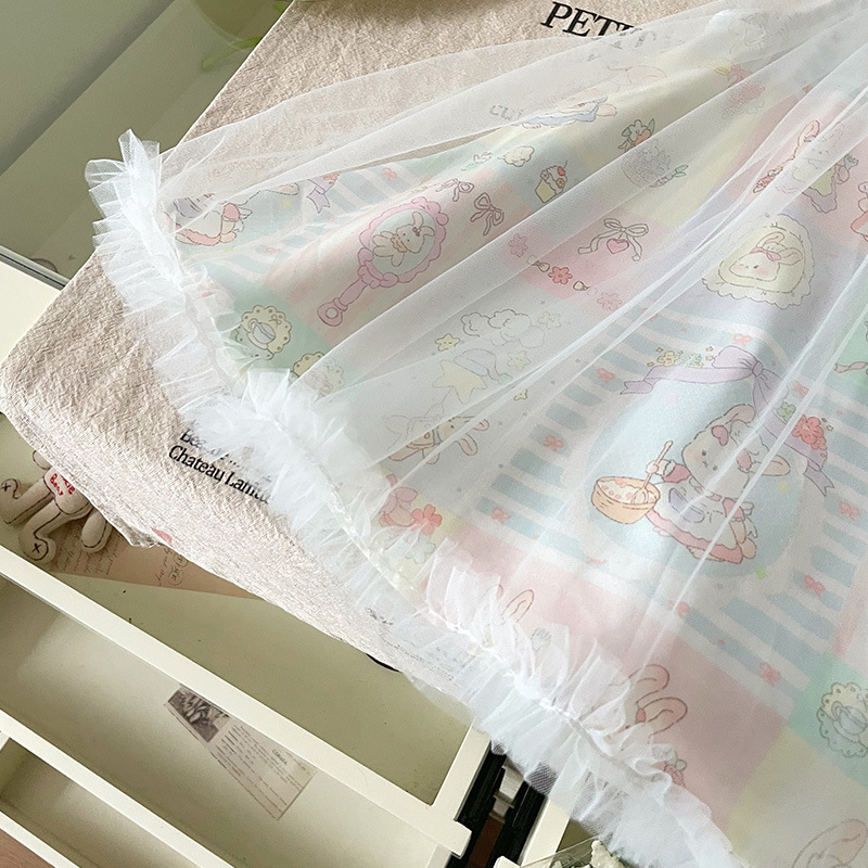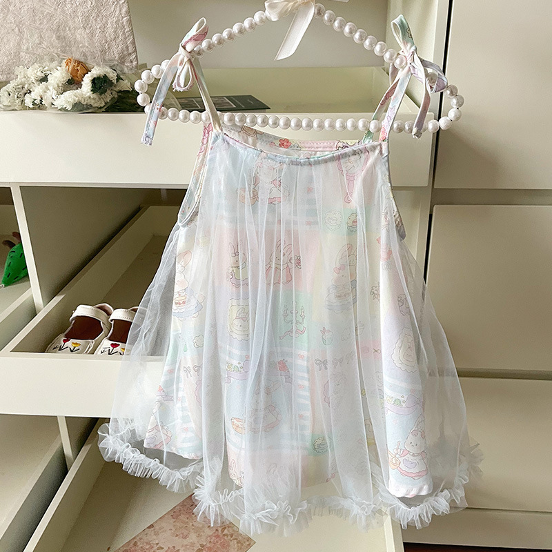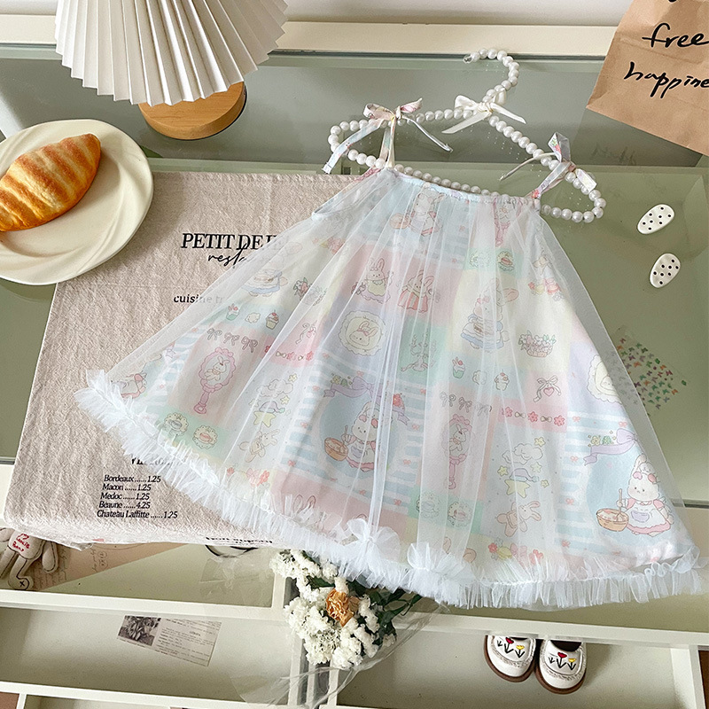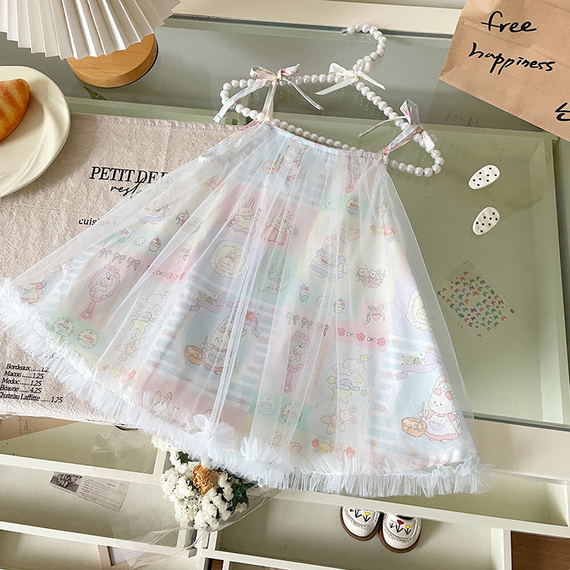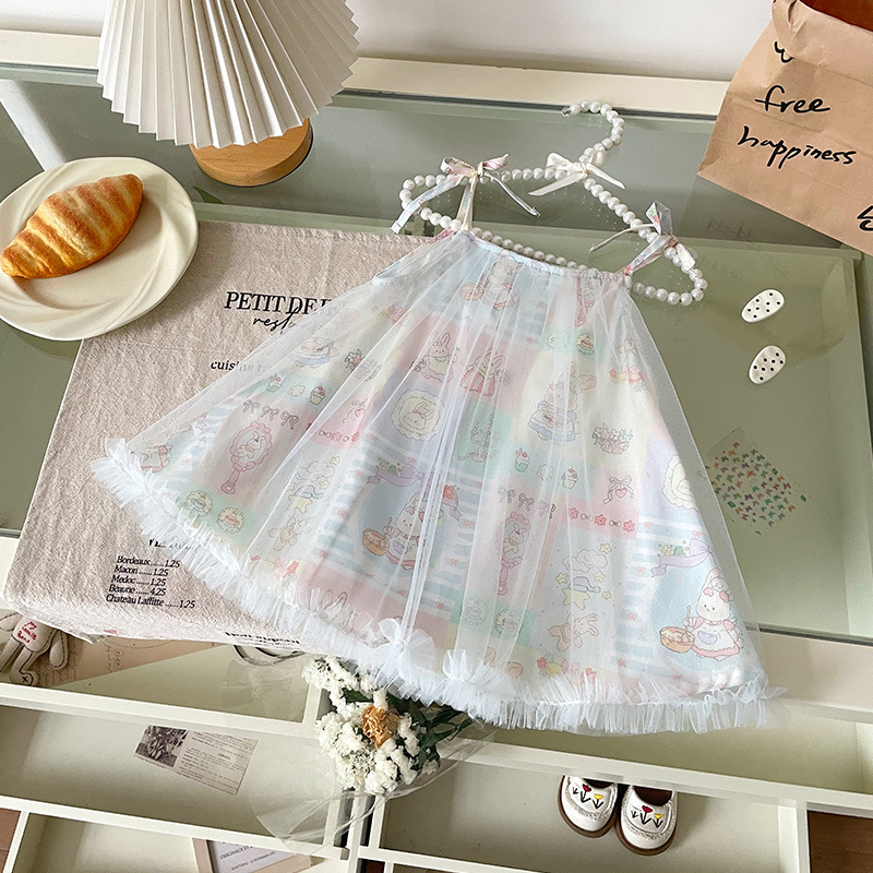 [재고] XQ259207 여자 원피스 2025 여름 새로운 어린이 재미 kt 고양이 거즈 외국 스타일 어린이 치마