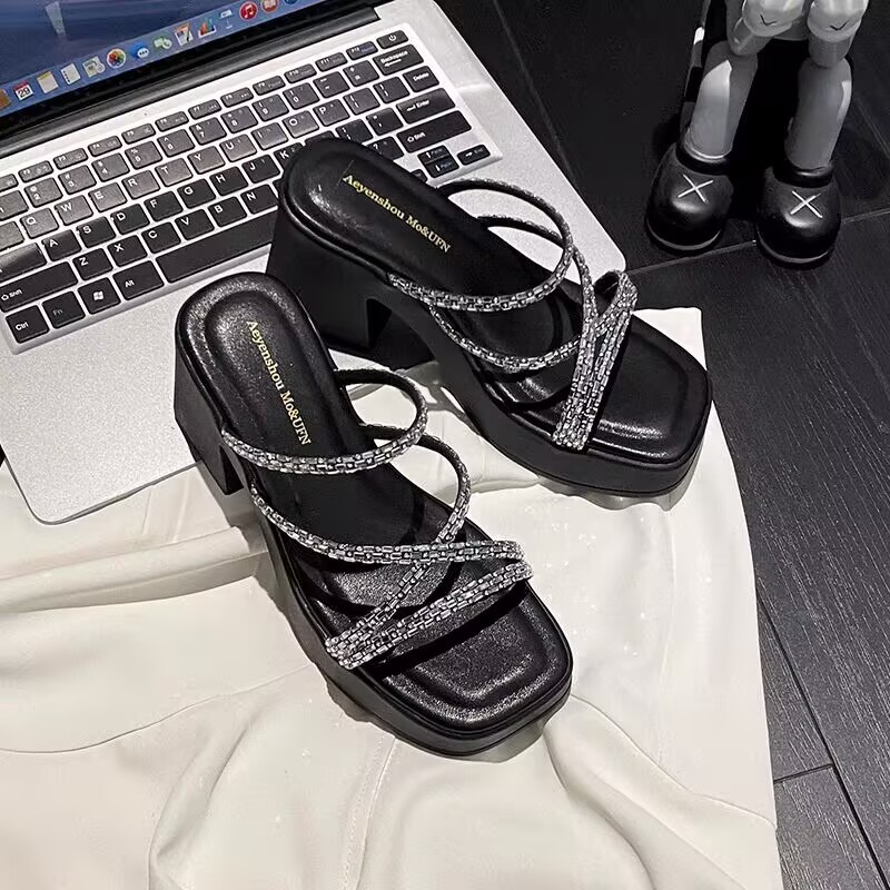 2025년 여름 신상 여성용 하이힐 두꺼운 굽 원라인 슬리퍼 한국 패션 요정 스타일 오픈 토 외부 여성화 트렌드