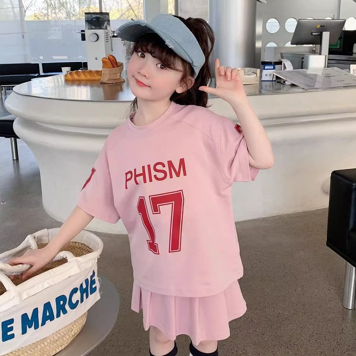 여름 한국 스타일 여아 정장 2025 여름 새로운 스타일 여아 캐주얼 반팔 중대형 어린이 주름 치마 투피스 세트