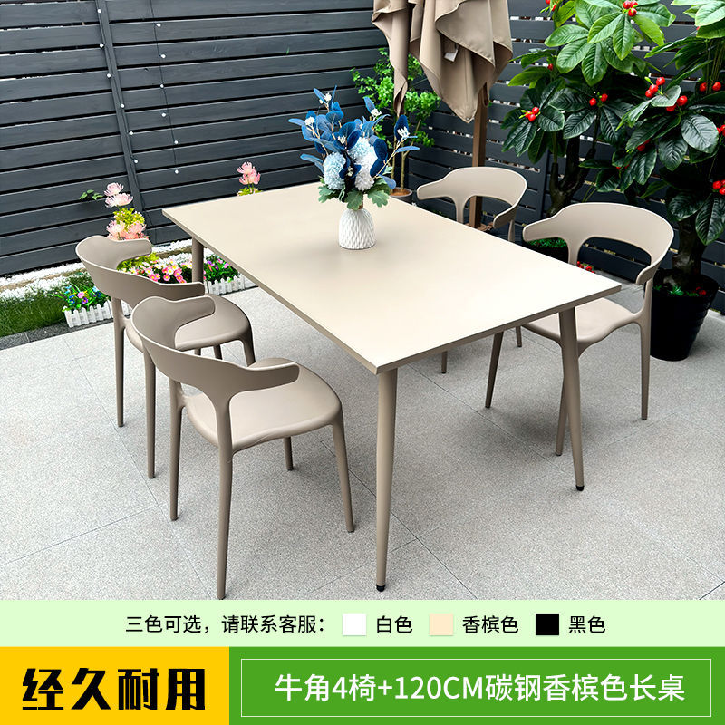 • 120X70 샴페인 컬러 콘다리 카본 스틸 롱 테이블 + 혼 체어 X6