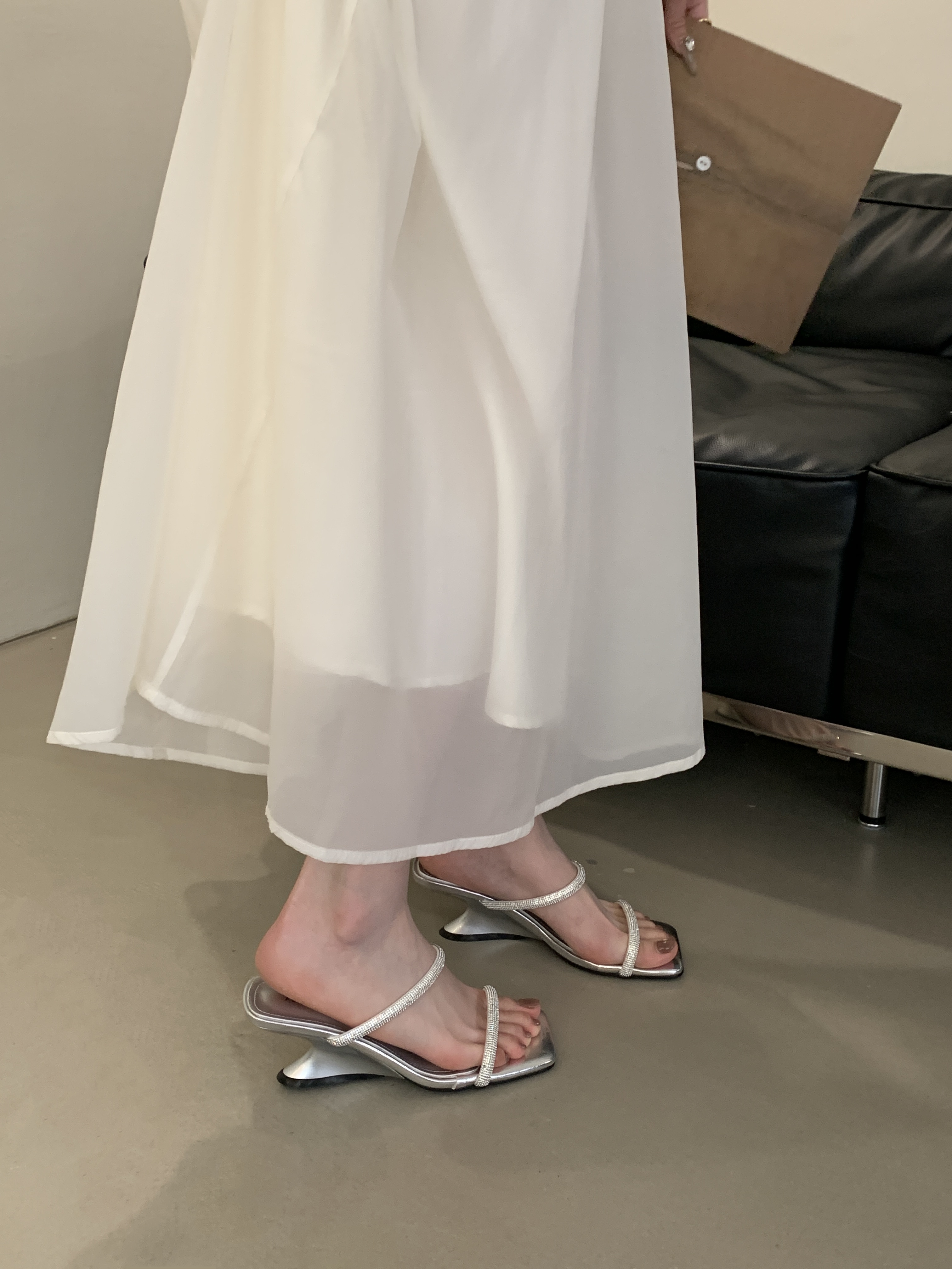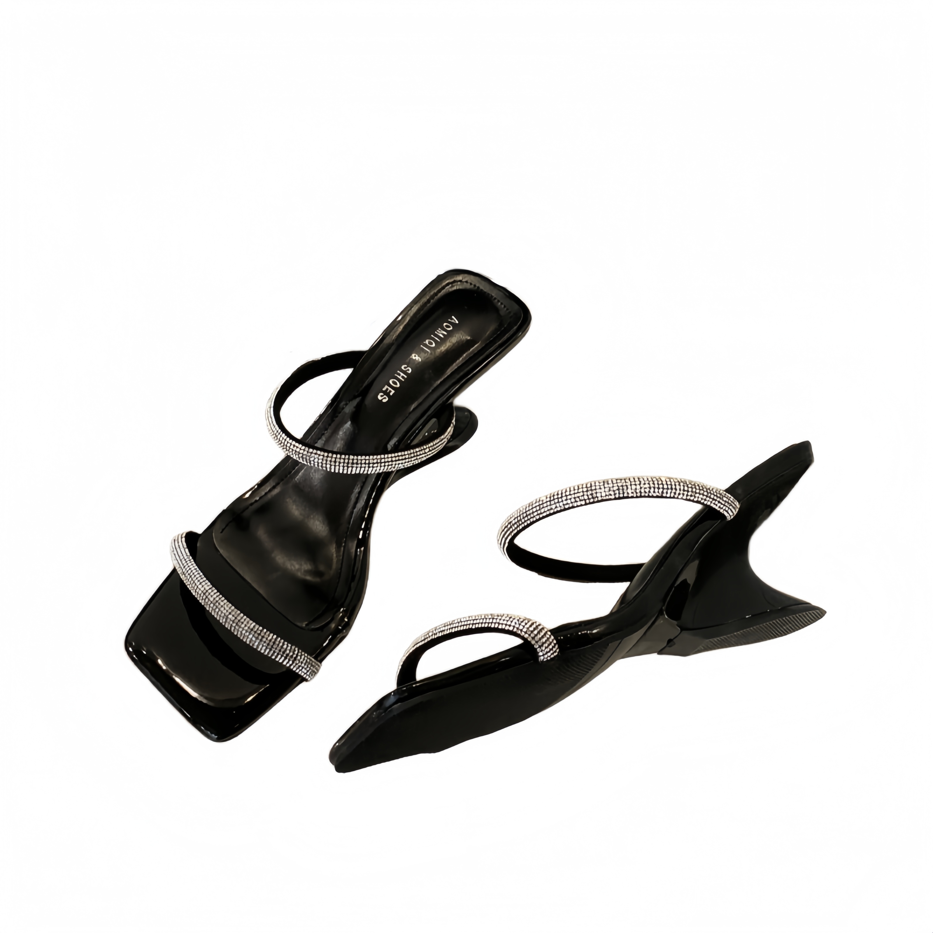 2025 새로운 여름 외출 웨지 라인스톤 샌들, 여성을위한 오픈 토 스퀘어 발가락 프랑스 하이힐
