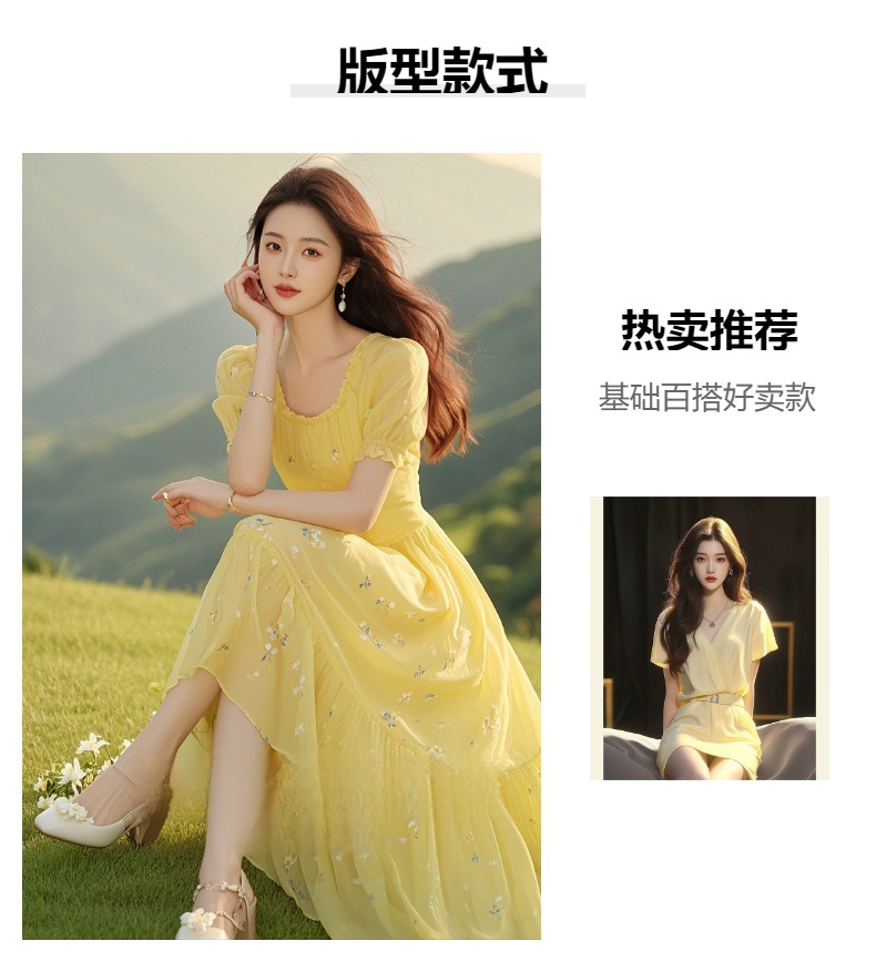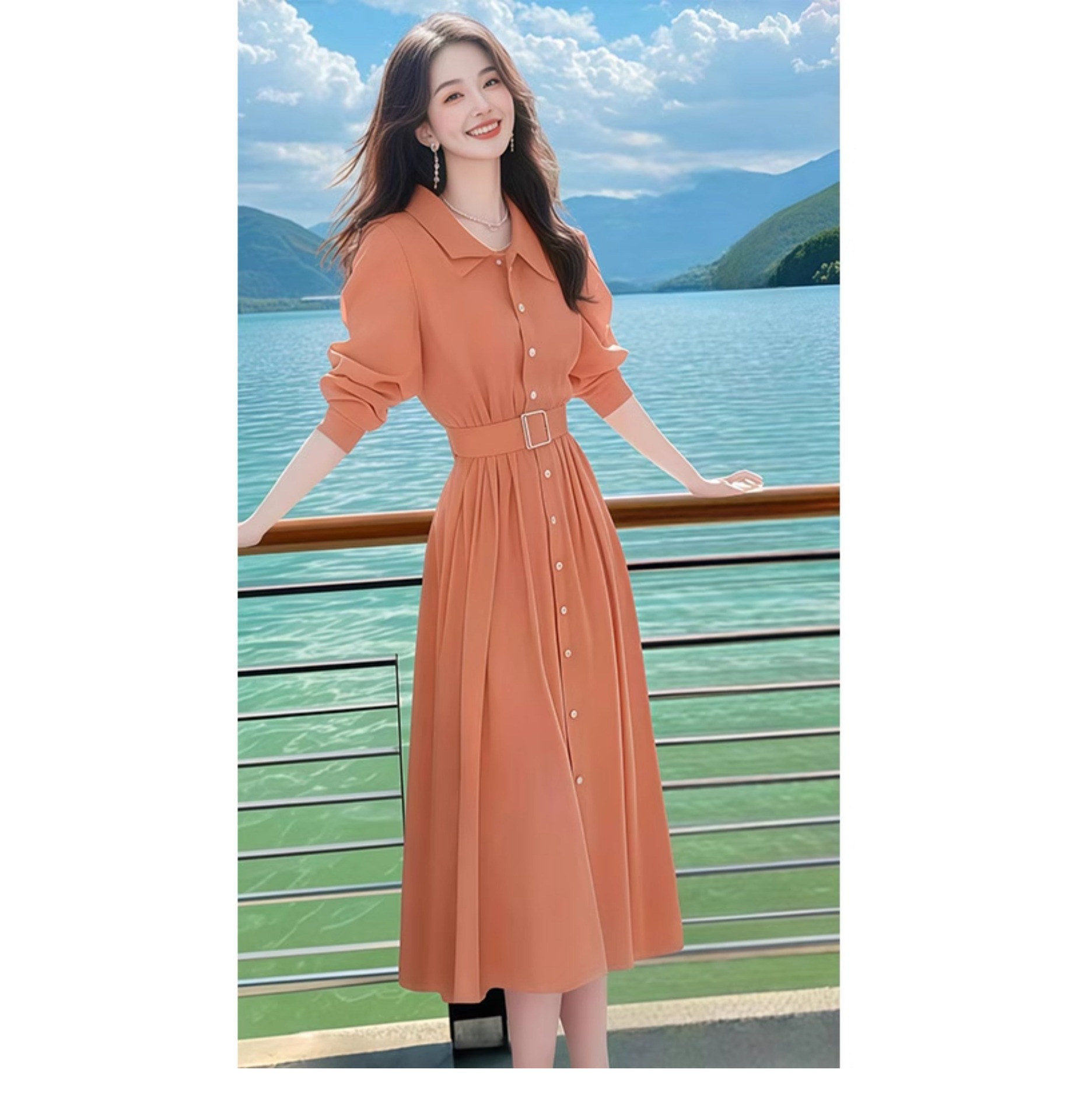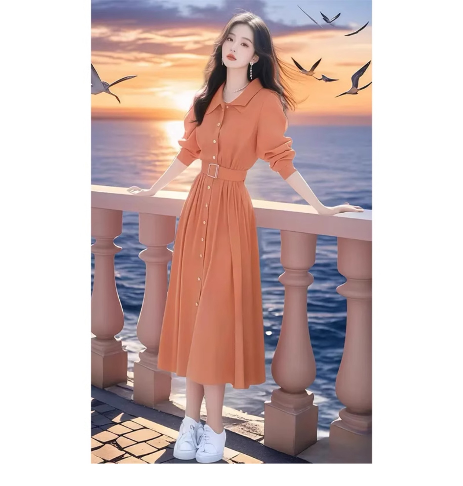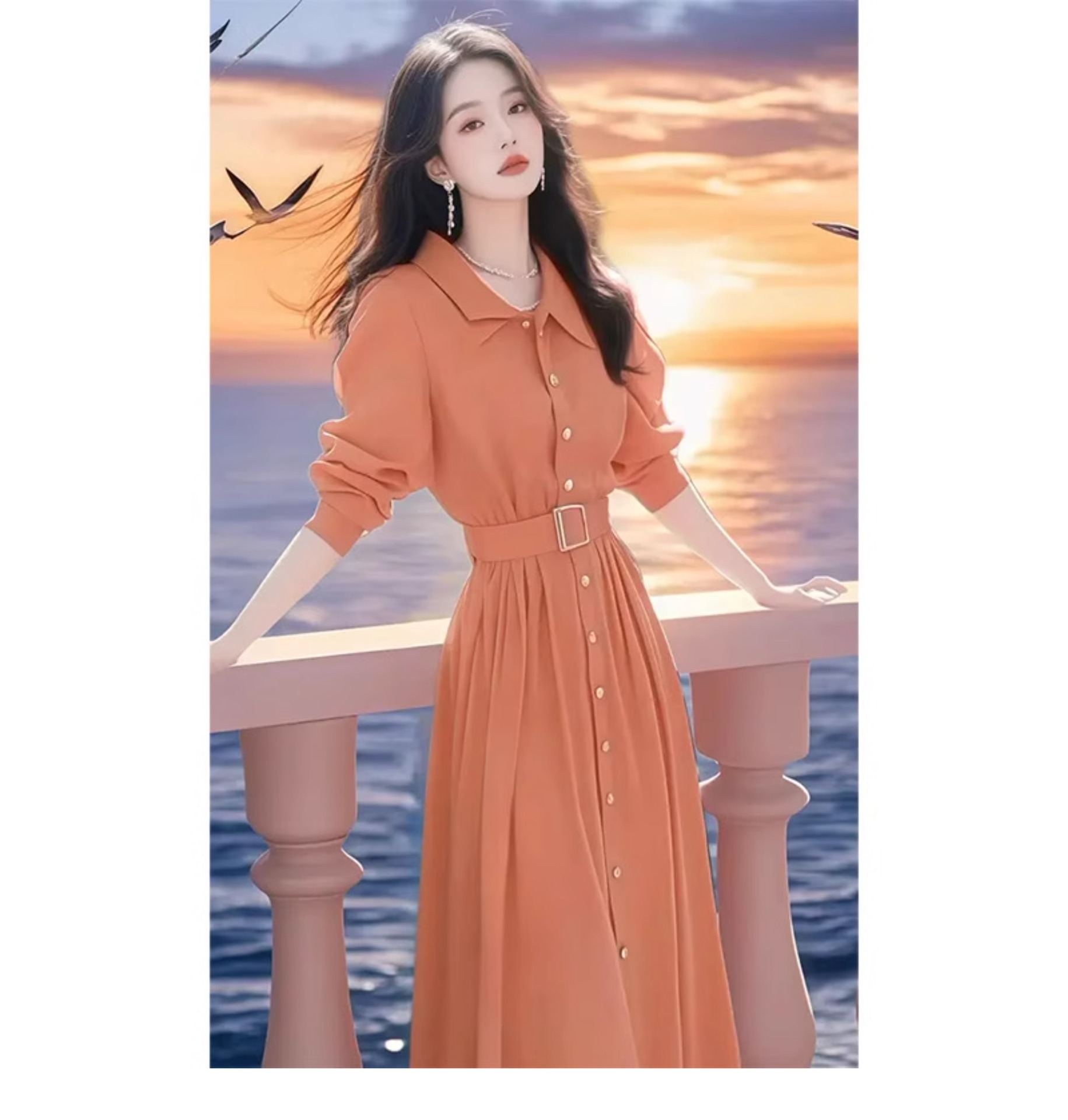 봄 프랑스 독특한 아름다운 기질 여신 팬 원피스 높은 감각 위엄있는 분위기 부드러운 바람 오렌지 원피스스토어 가기