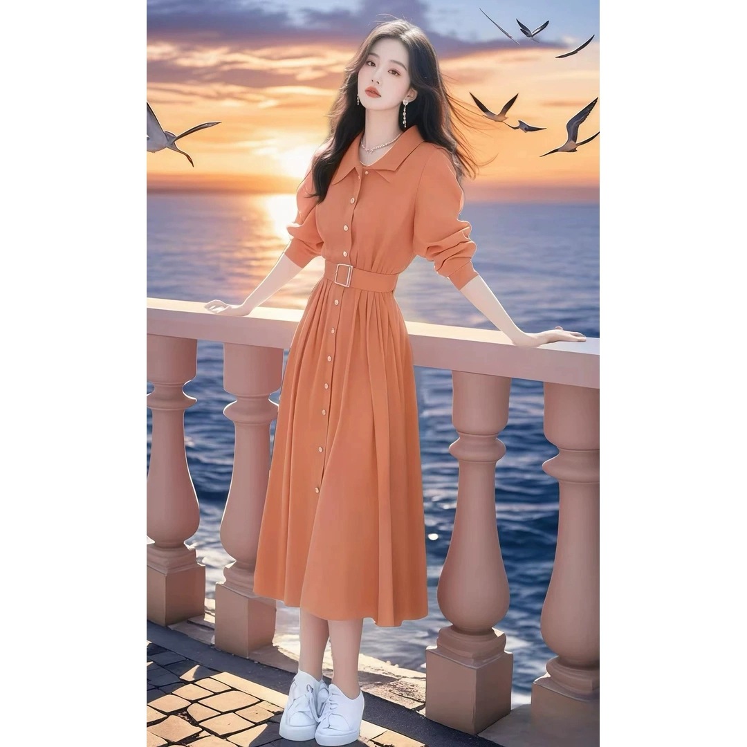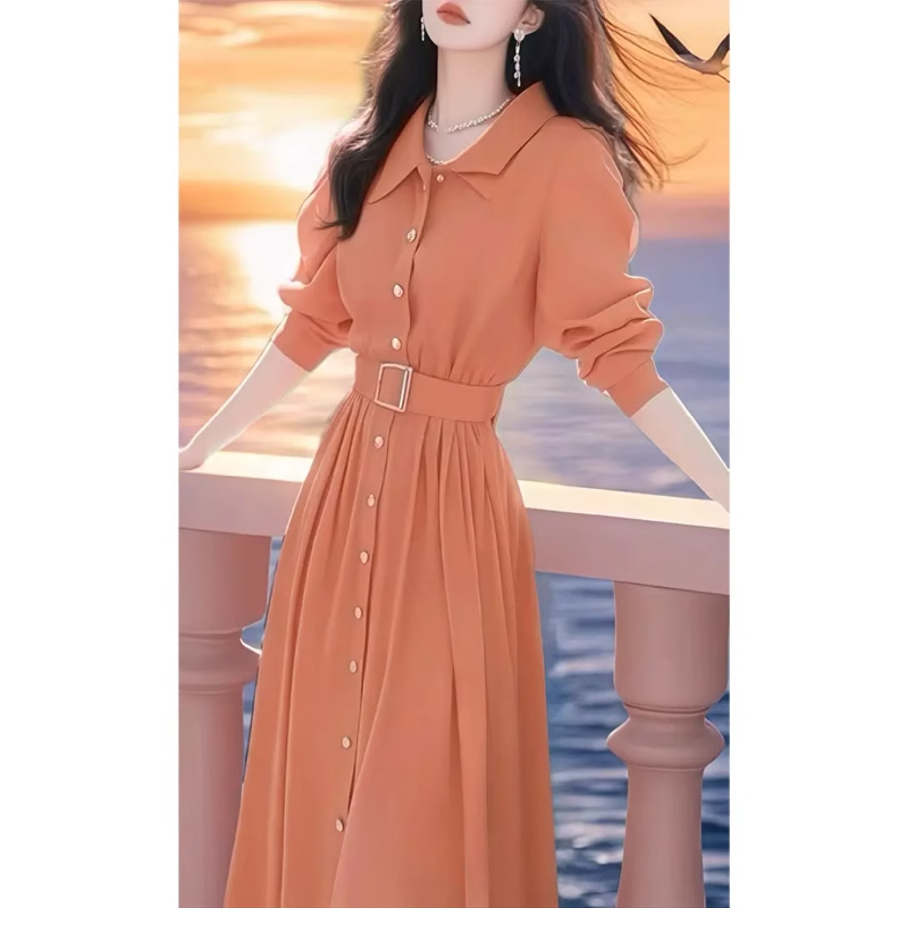 봄 프랑스 독특한 아름다운 기질 여신 팬 원피스 높은 감각 위엄있는 분위기 부드러운 바람 오렌지 원피스