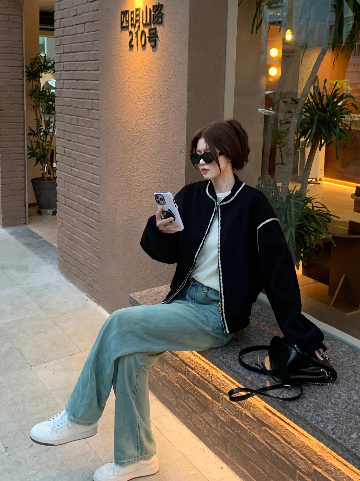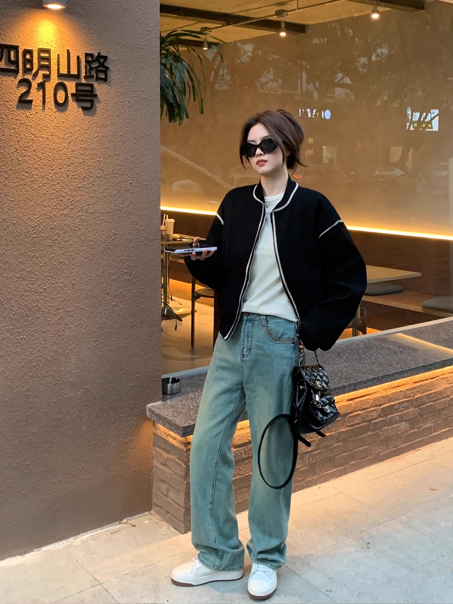 밀 패턴 레트로 캐주얼 짧은 야구 세트 여자 봄 새로운 느슨한 블랙 카디건 재킷 코트