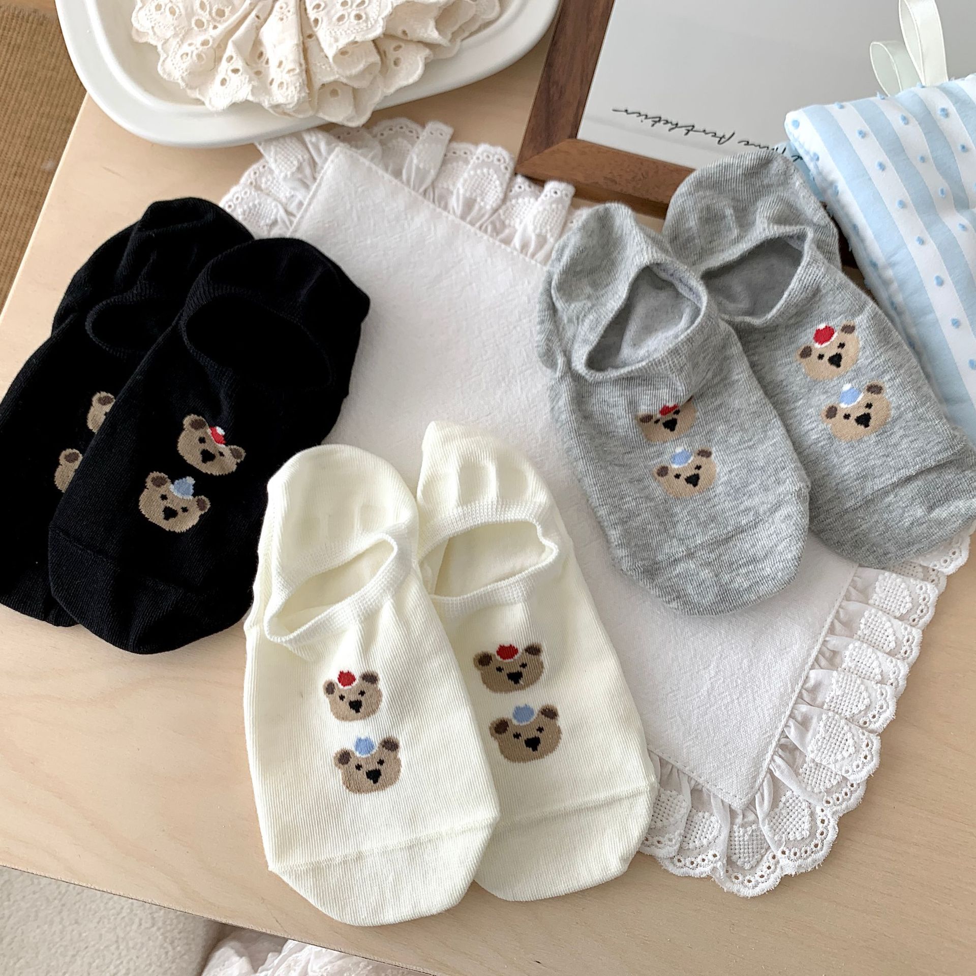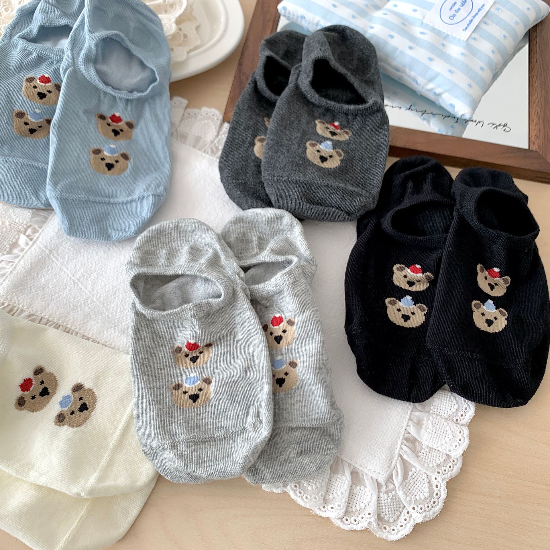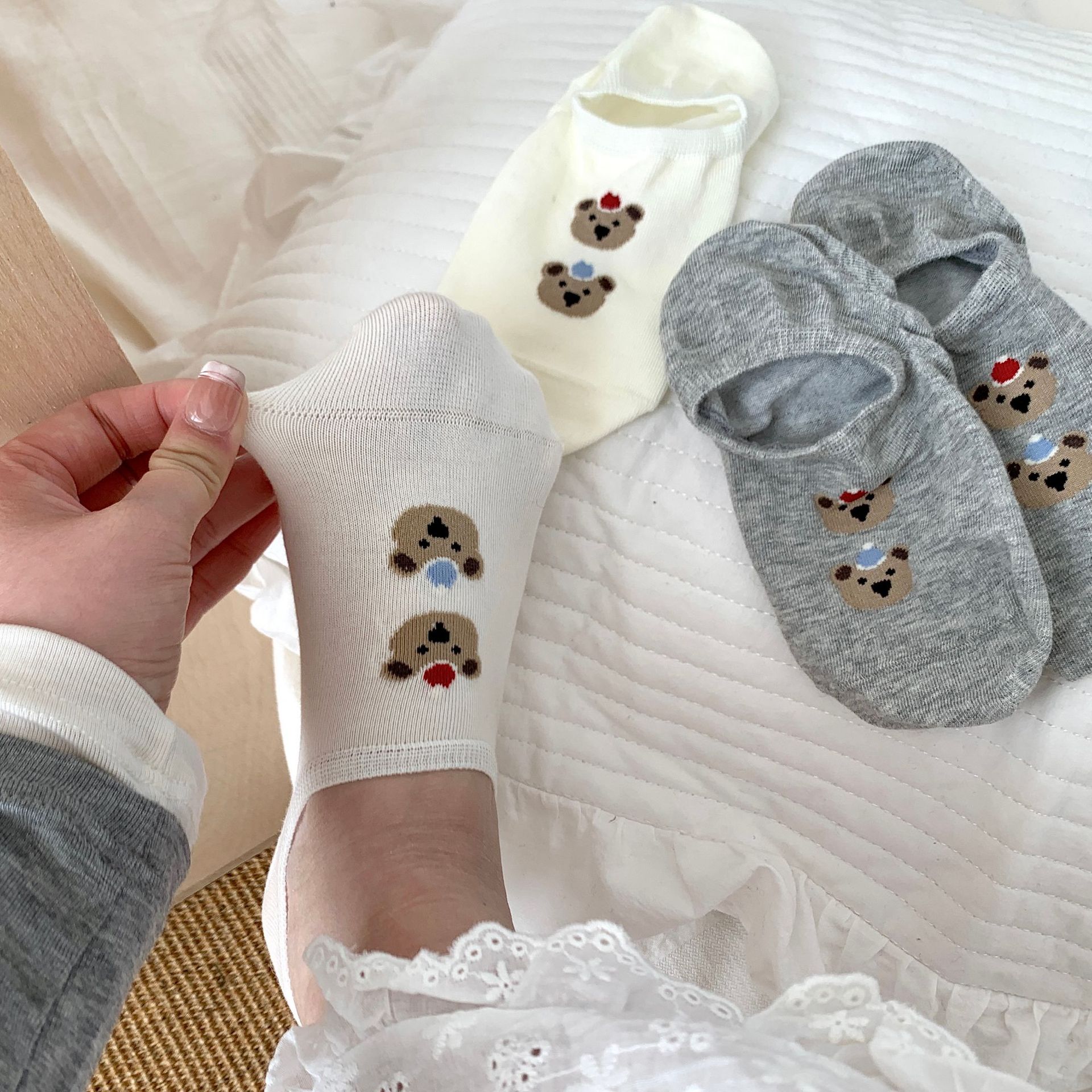 봄 여름 면 보트 양말, 곰 얇은 미끄럼 방지 실리콘 얕은 양말, 뼈없는 통기성 면 보이지 않는 양말스토어 가기
