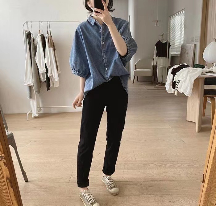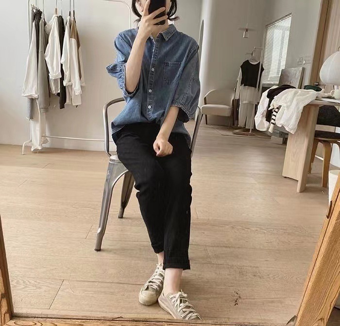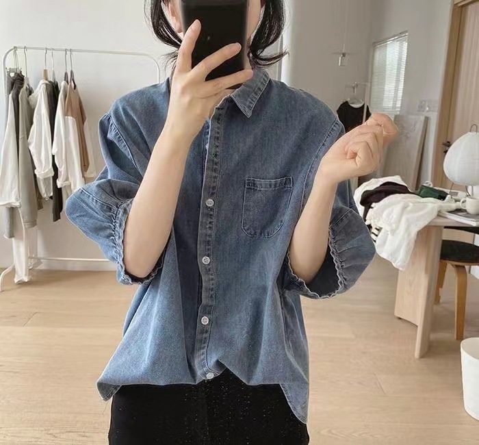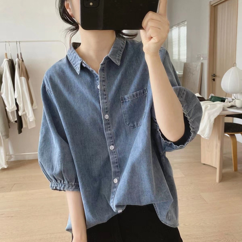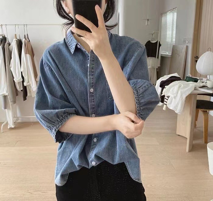 등불 소매 데님 셔츠 여성용 여름 새로운 느슨한 슬리밍 레트로 반소매 틈새스토어 가기