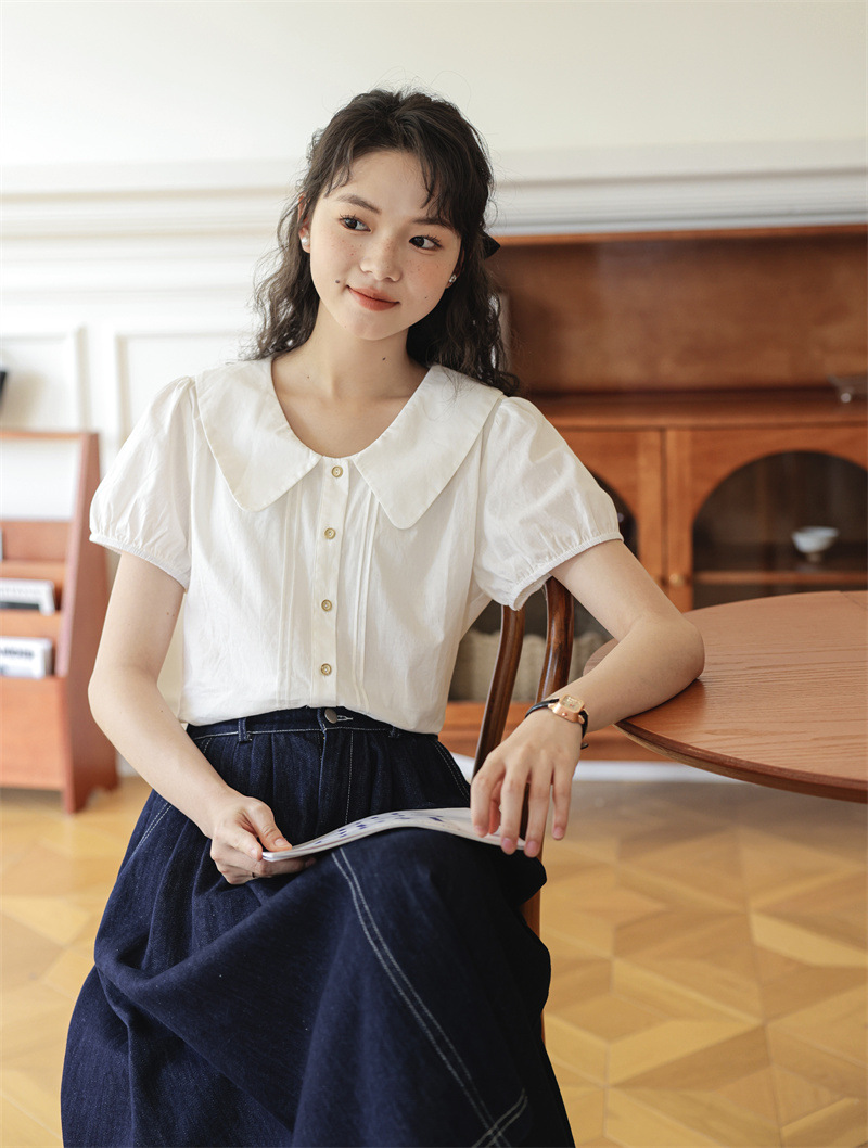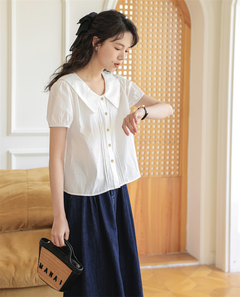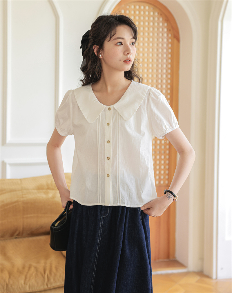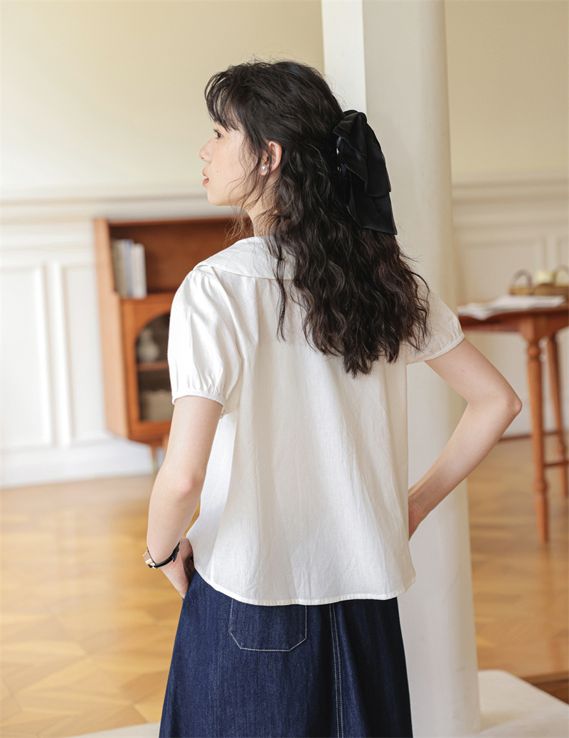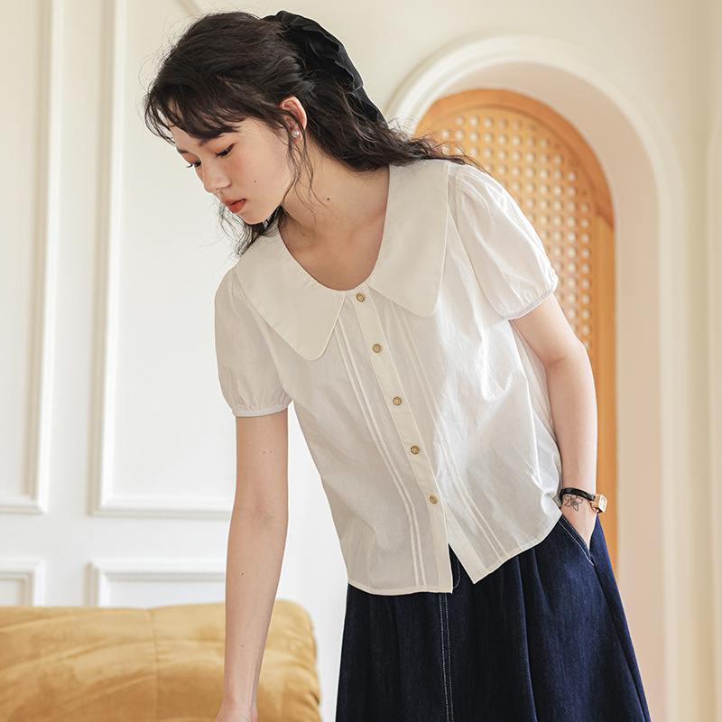 리얼 샷 2025 여름 새로운 프랑스 달콤한 순수한 나이 감소 인형 칼라 작은 거품 짧은 소매 흰색 셔츠 여성스토어 가기