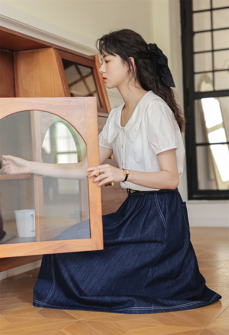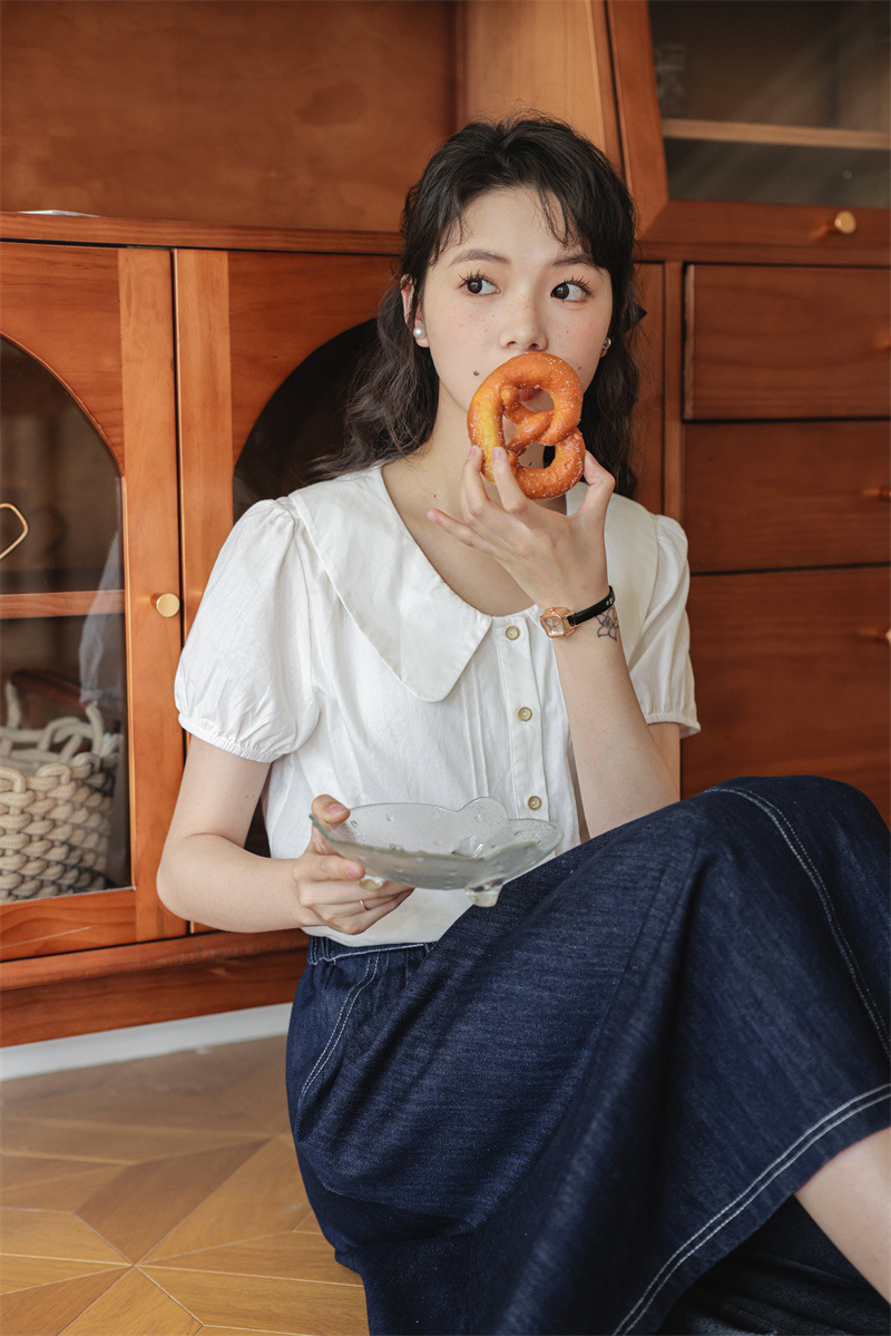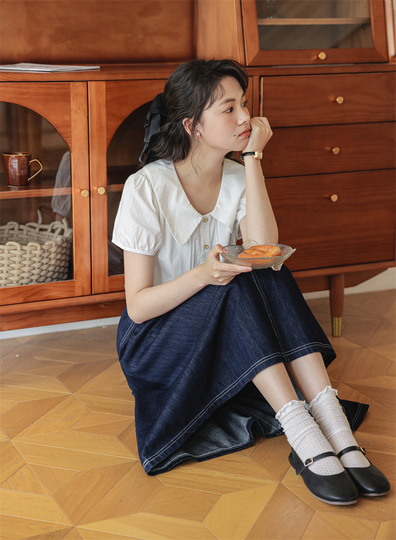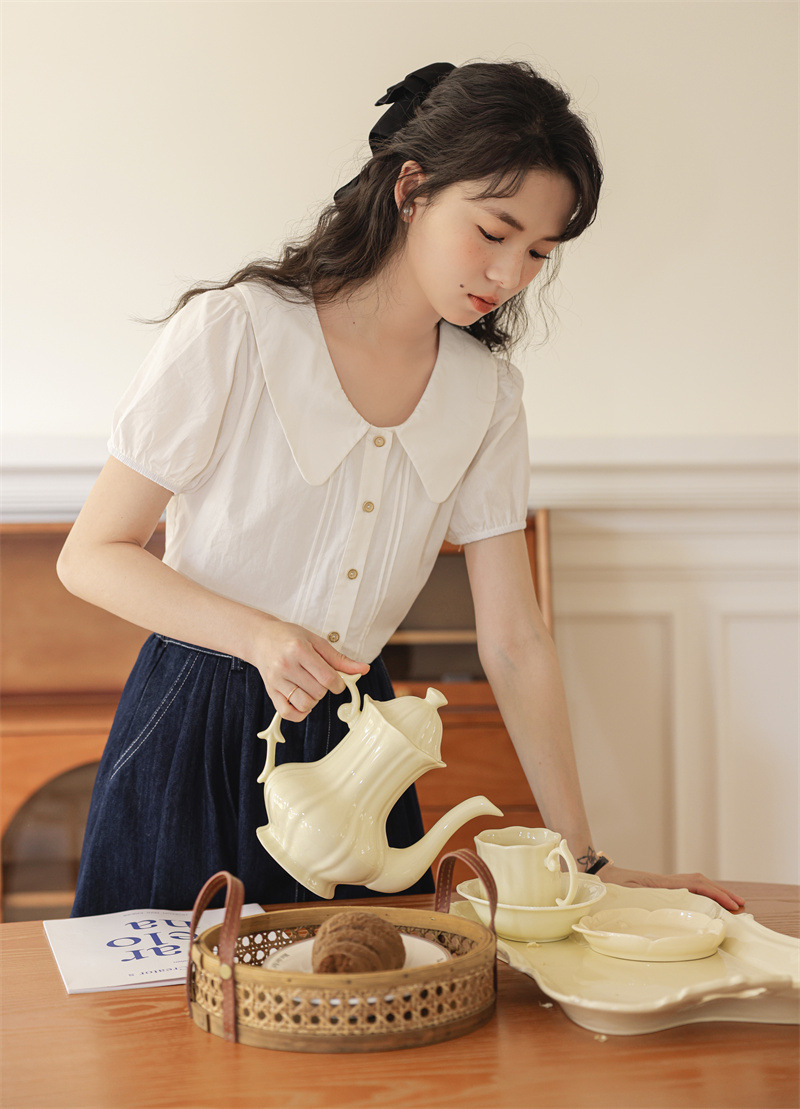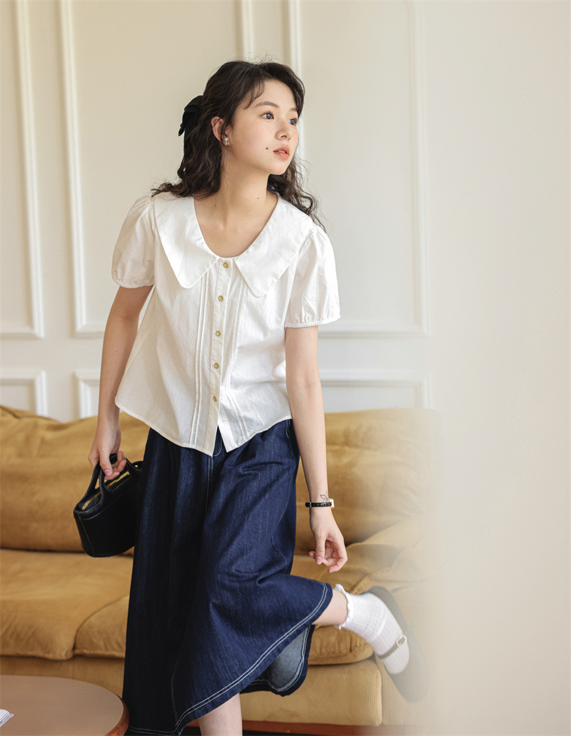 리얼 샷 2025 여름 새로운 프랑스 달콤한 순수한 나이 감소 인형 칼라 작은 거품 짧은 소매 흰색 셔츠 여성스토어 가기
