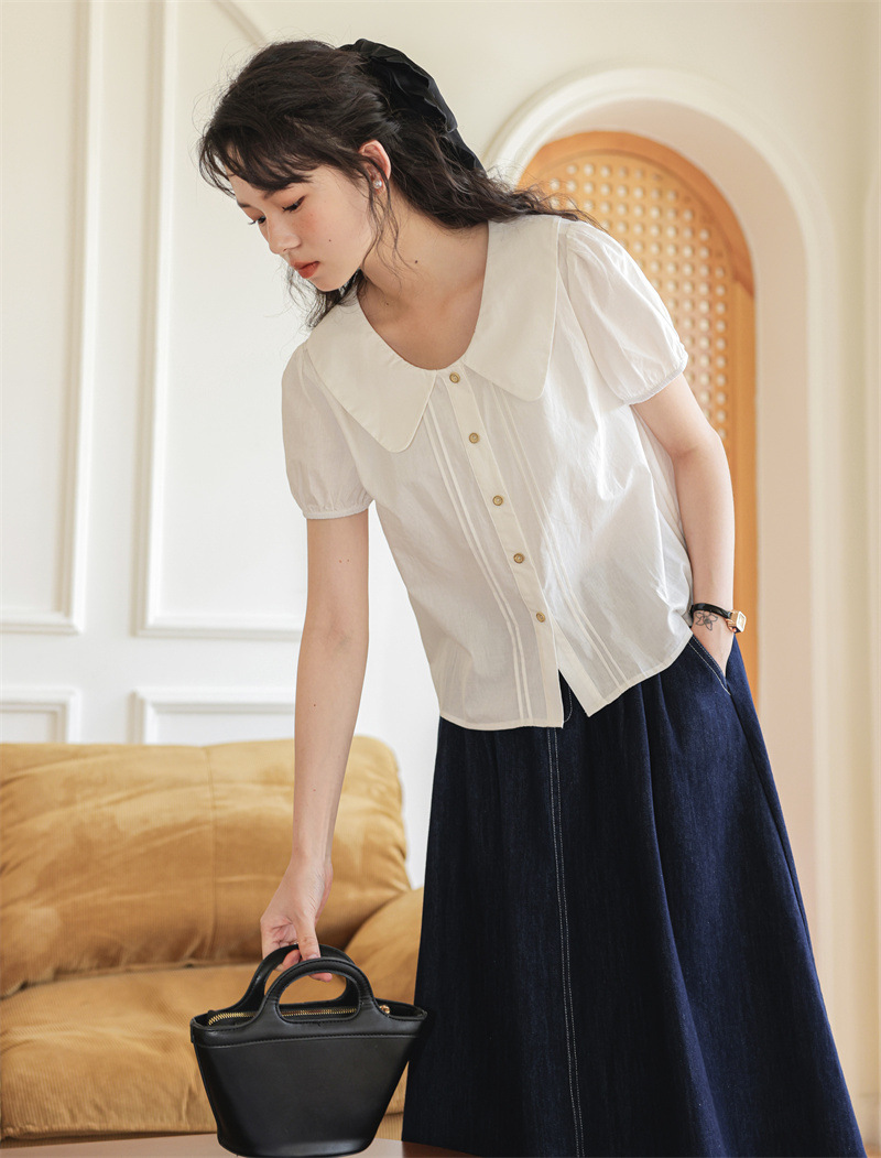 리얼 샷 2025 여름 새로운 프랑스 달콤한 순수한 나이 감소 인형 칼라 작은 거품 짧은 소매 흰색 셔츠 여성