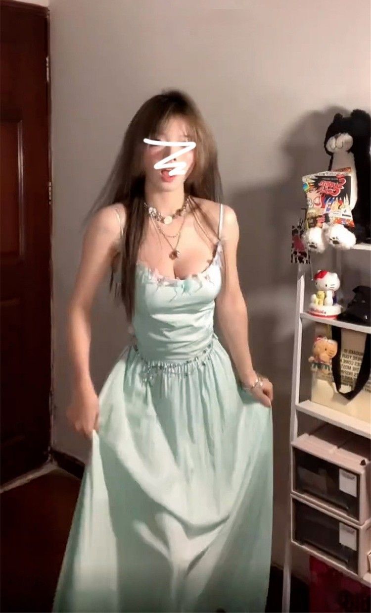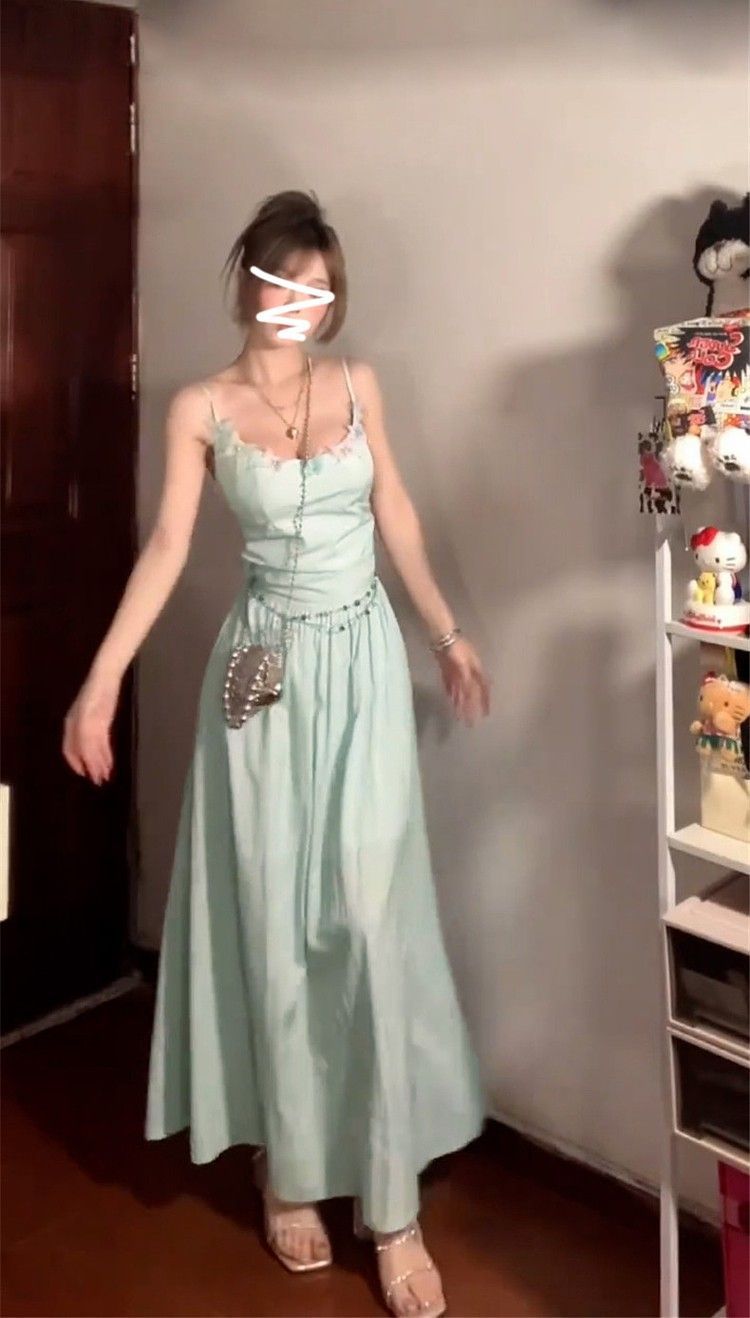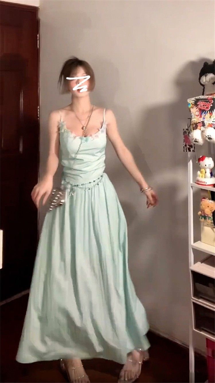 녹색 백리스 스트랩 원피스 어린이 여름 해변 휴가 프랑스 고급 기질 허리 A-라인 원피스