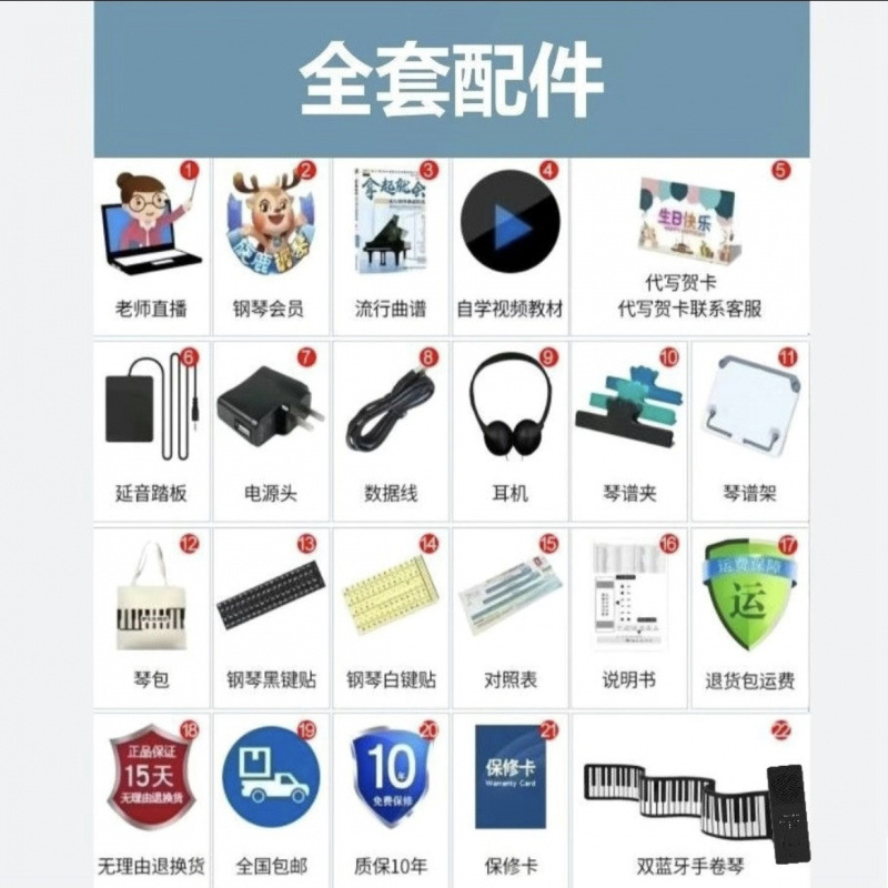 • 88에는 듀얼 블루투스 + 페달 + 보면대 + 가방 + 스티커가 함께 제공됩니다.