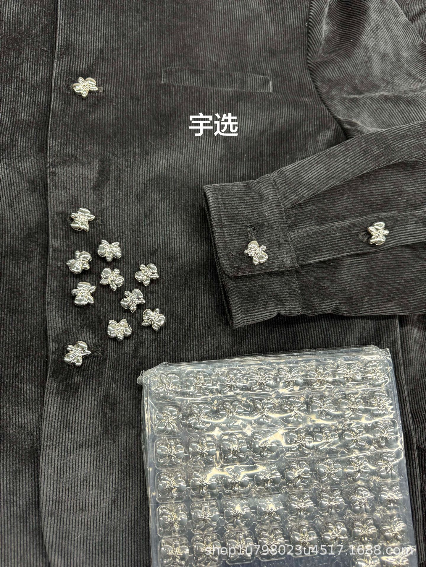 每件衣服9粒金属挂镀亮银色蝴蝶扣以封油工艺锁住光泽