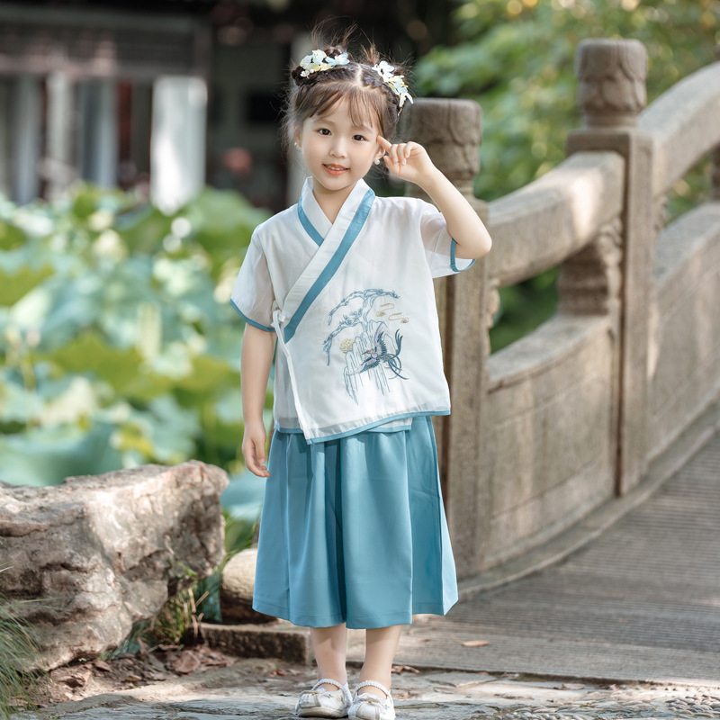 Hanfu 어린이 여름 정장 2025 새로운 중국 스타일 아기 새로운 중국 스타일 당나라 정장 어린이 여름 얇은 의상