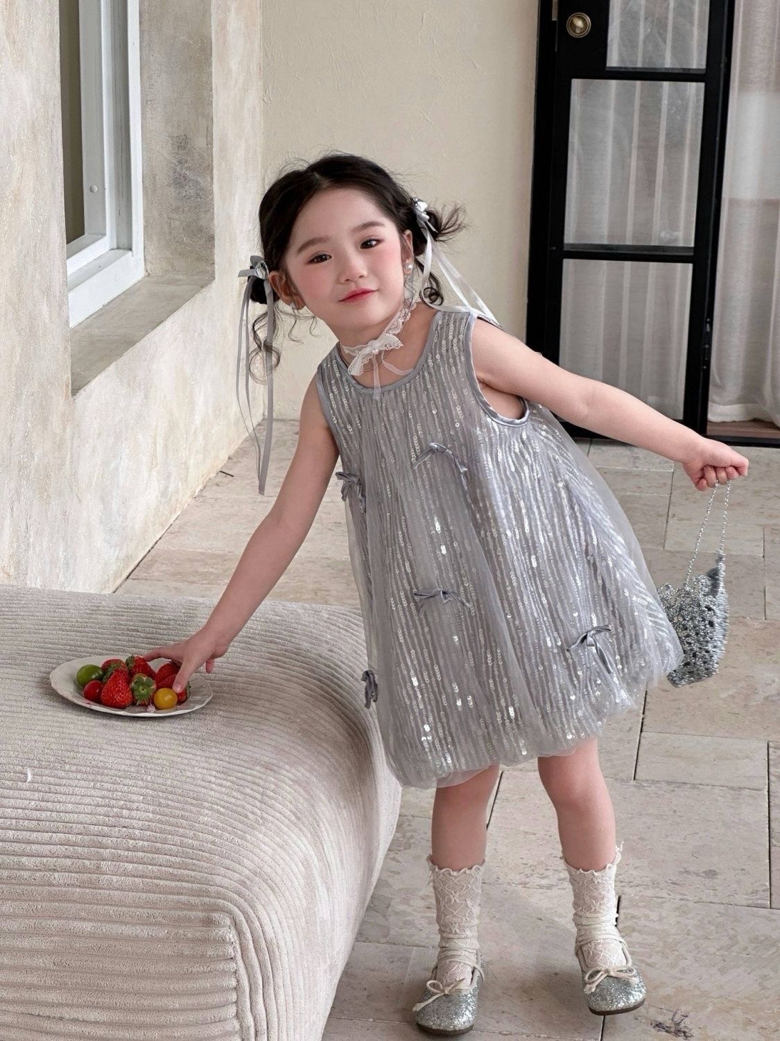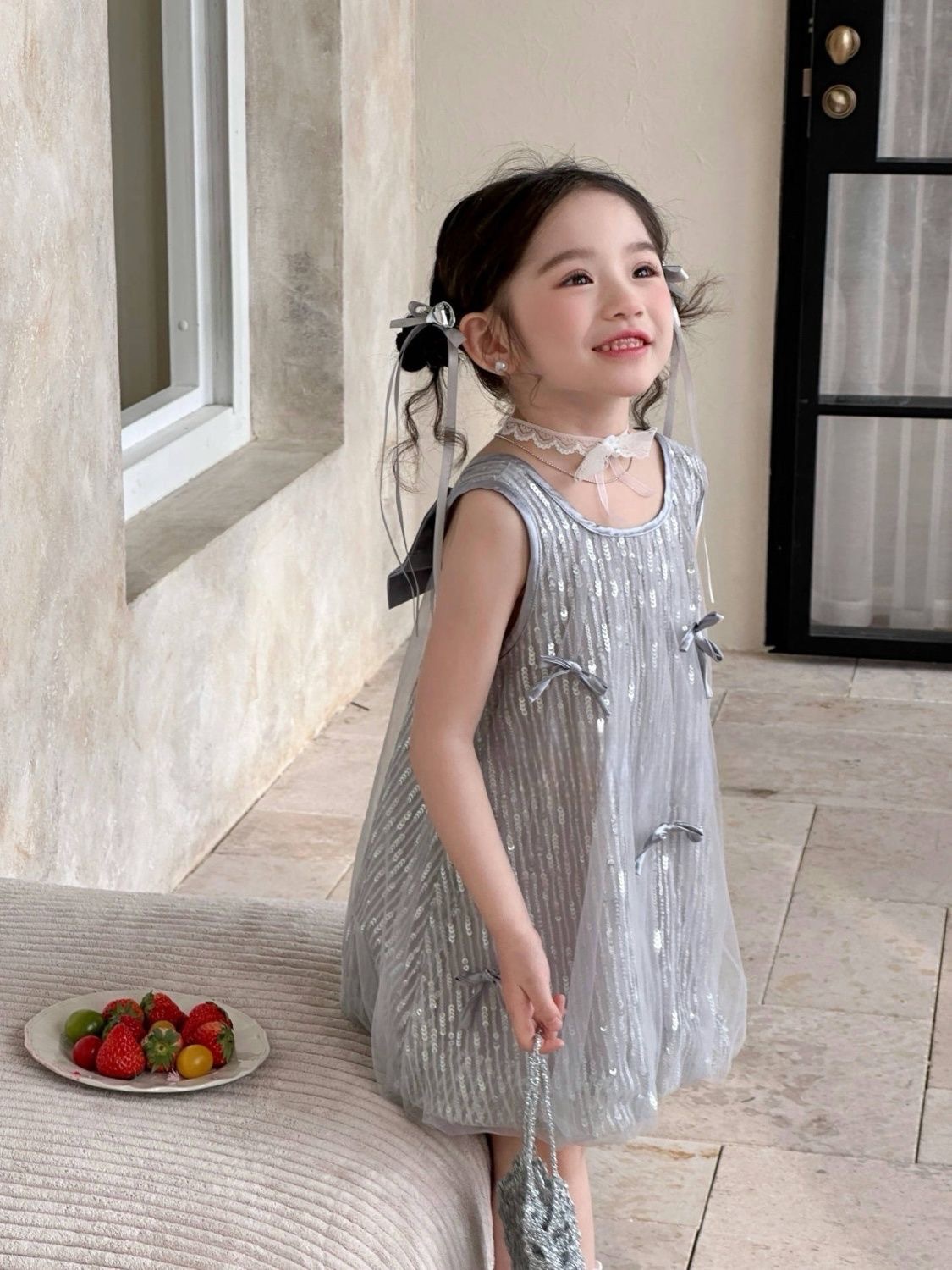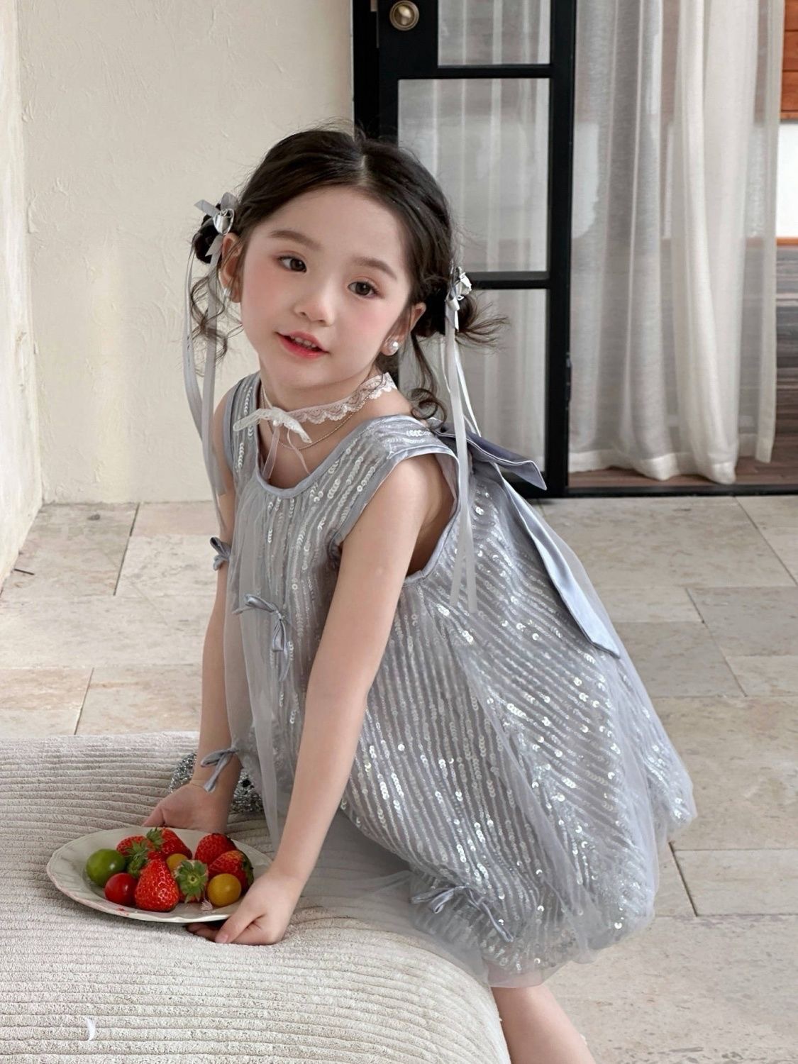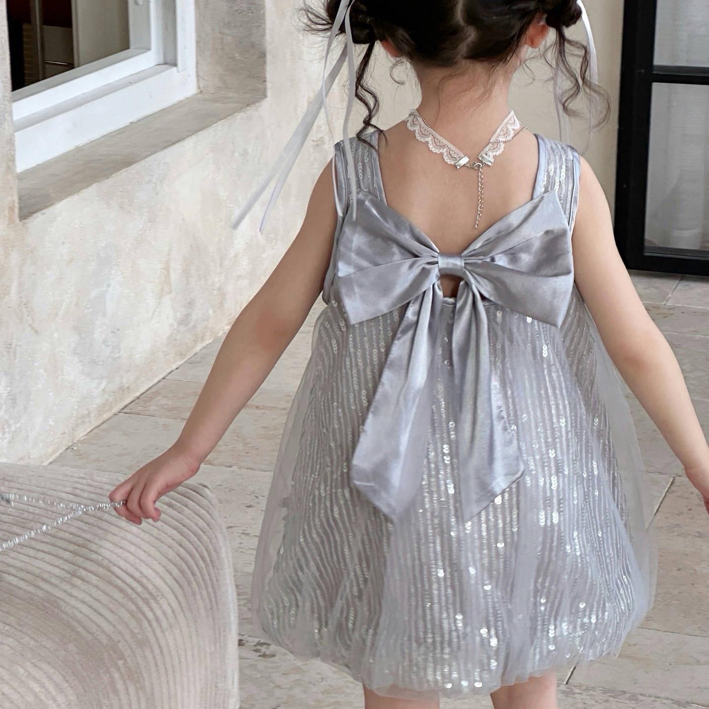 Sequin Skirt 여름 2025 새로운 도착 활 조끼 공주 원피스 아기 소녀의 원피스 백리스 스타일