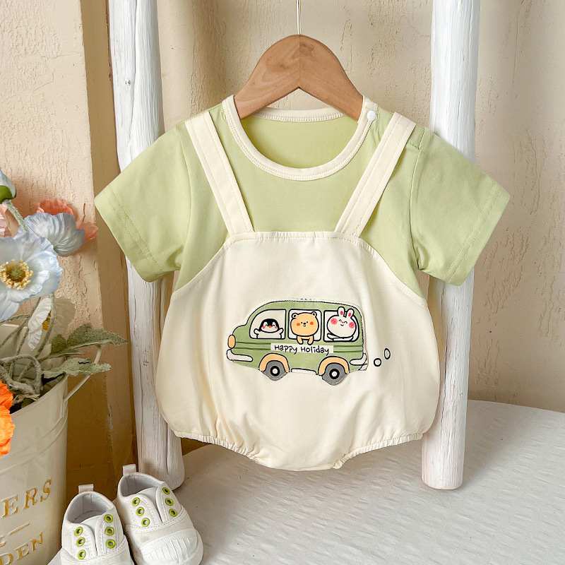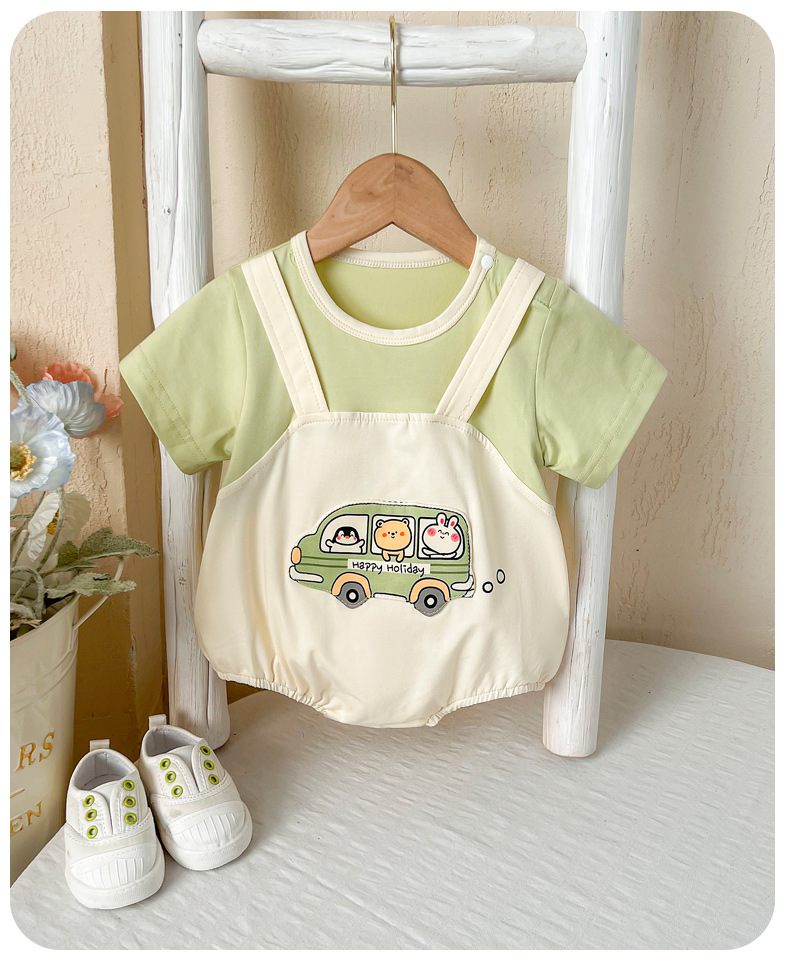 아기의 포장 뚱뚱한 옷 여름 얇은 삼각형 만화 귀여운 가짜 두 조각 아기 남자와 여자의 여름 나가는 원피스 옷