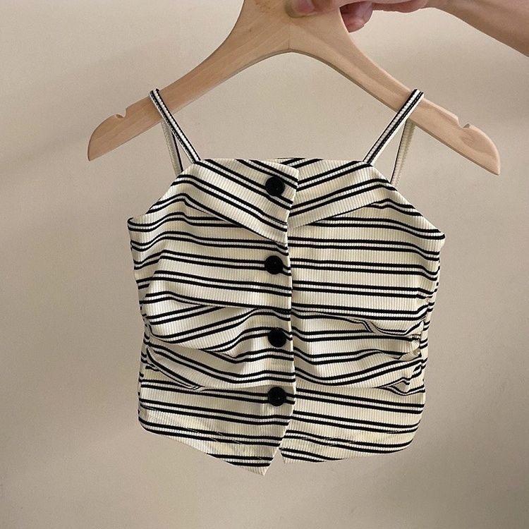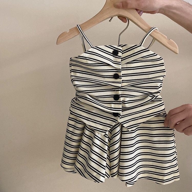 여름 2025 새로운 스타일 서양식 디자인 주름 줄무늬 슬링 반바지 2 종 세트 트렌디 한 소녀의 캐주얼 세트