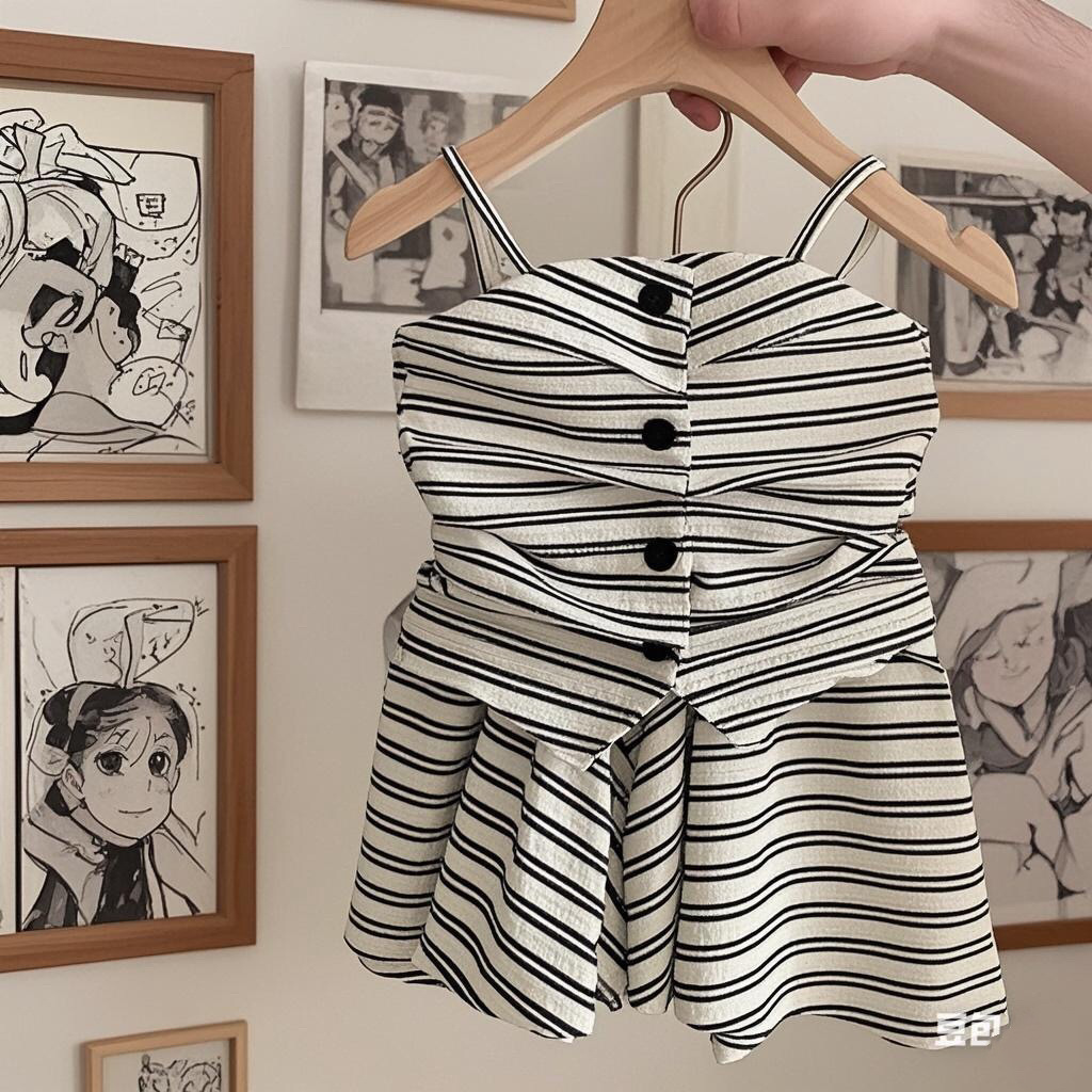 여름 2025 새로운 스타일 서양식 디자인 주름 줄무늬 슬링 반바지 2 종 세트 트렌디 한 소녀의 캐주얼 세트스토어 가기