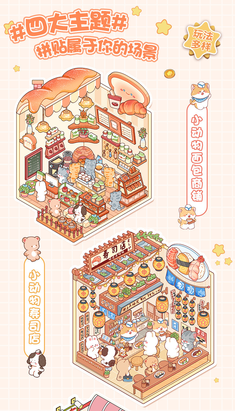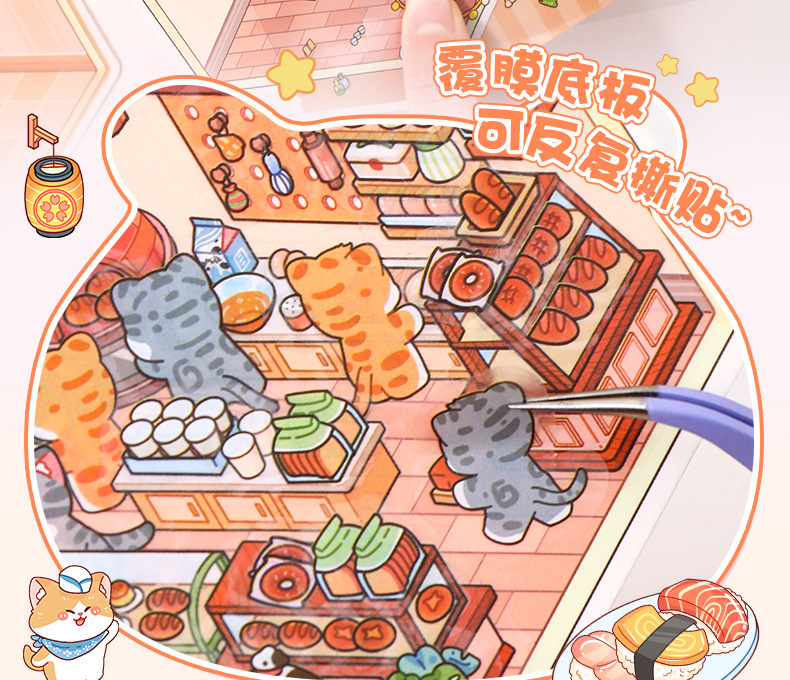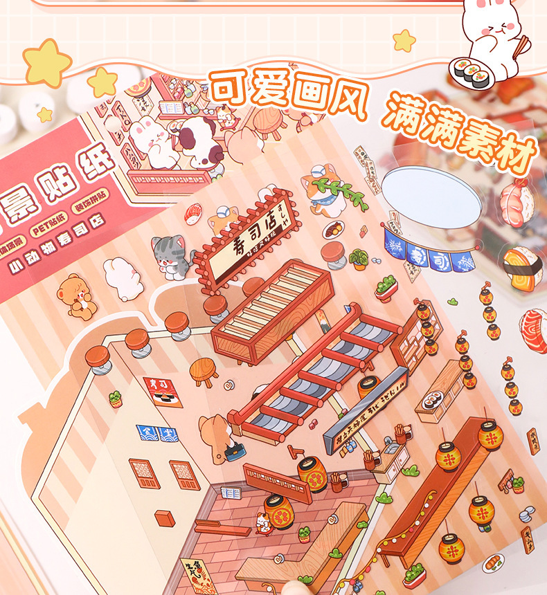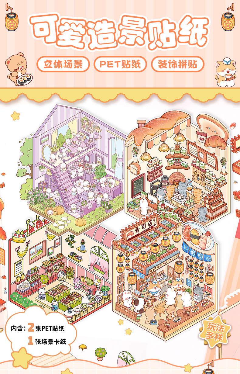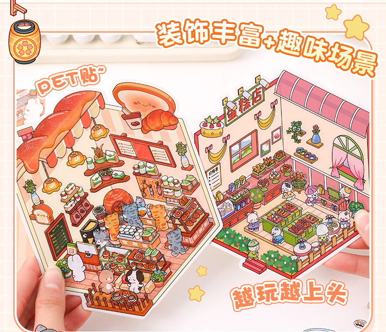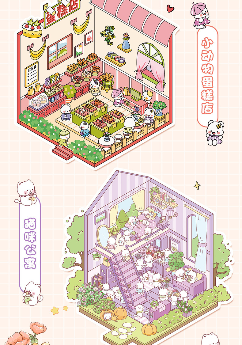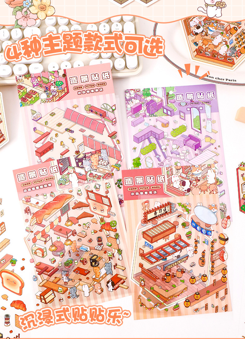 고양이 아파트 풍경 스티커 새로운 미니어처 장면 diy 스티커 3D 입체 오두막 귀여운 장면 스택 스티커스토어 가기