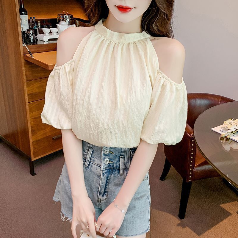활 레이스 업 디자인 목 셔츠 반팔 여성용 여름 퍼프 소매 쉬폰 셔츠 빈 어깨 탑 여름스토어 가기