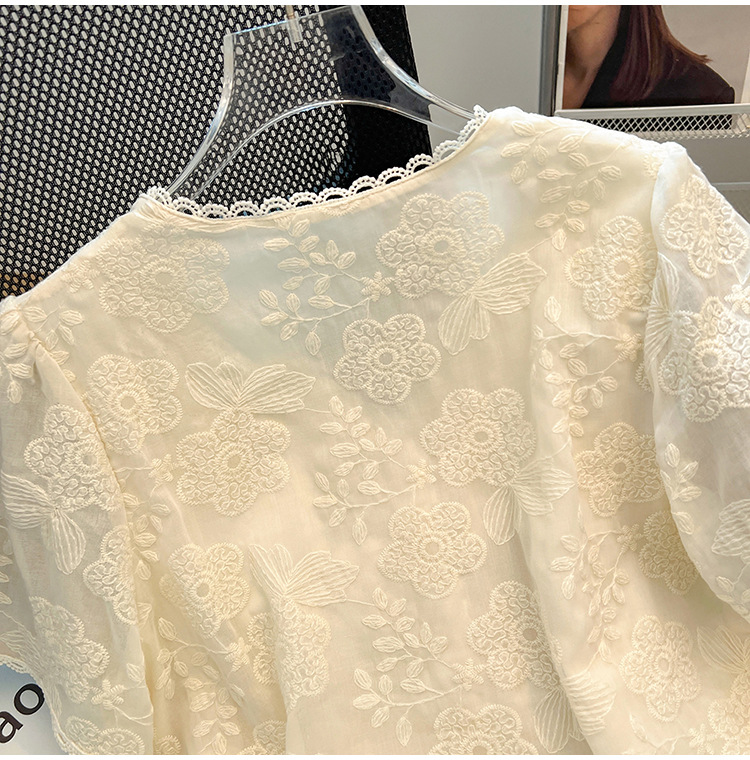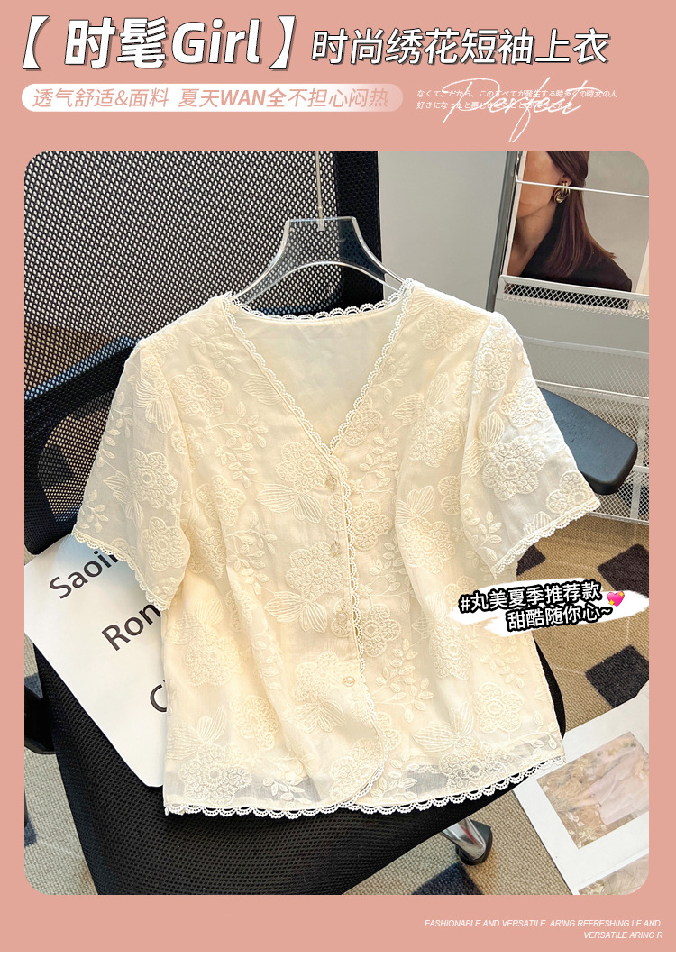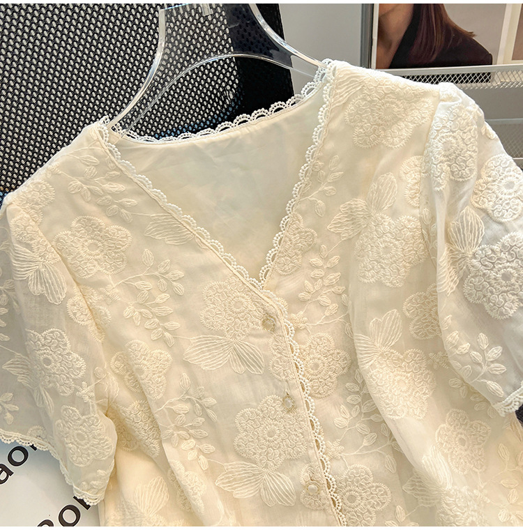 프랑스 스타일 우아한 레이스 V 넥 반팔 셔츠 여성 2025 년 여름 짧은 부드러운 나이 감소 한국 자수 작은 셔츠 탑