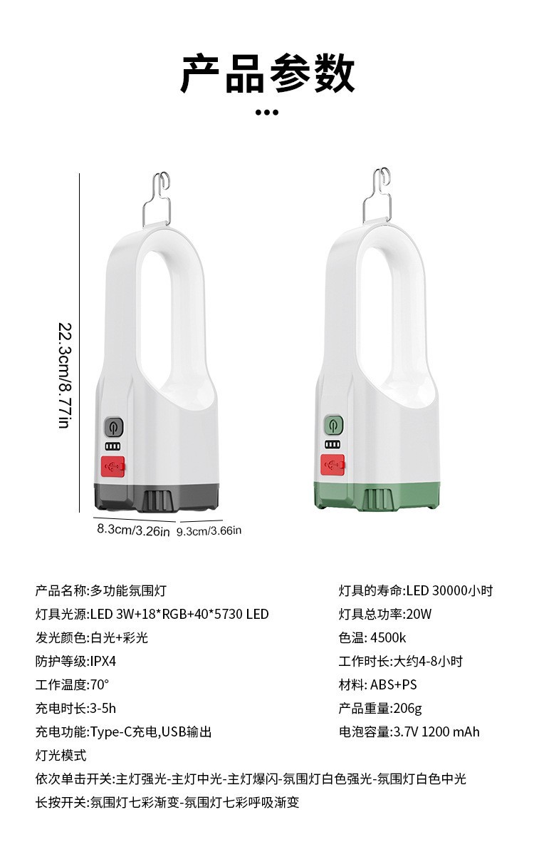 야외 캠핑 7 색 분위기 빛 다기능 USB 충전 휴대용 조명 휴대 전화 비상 충전 작업 조명