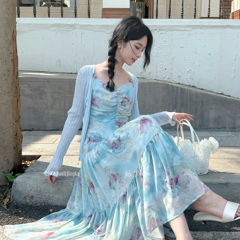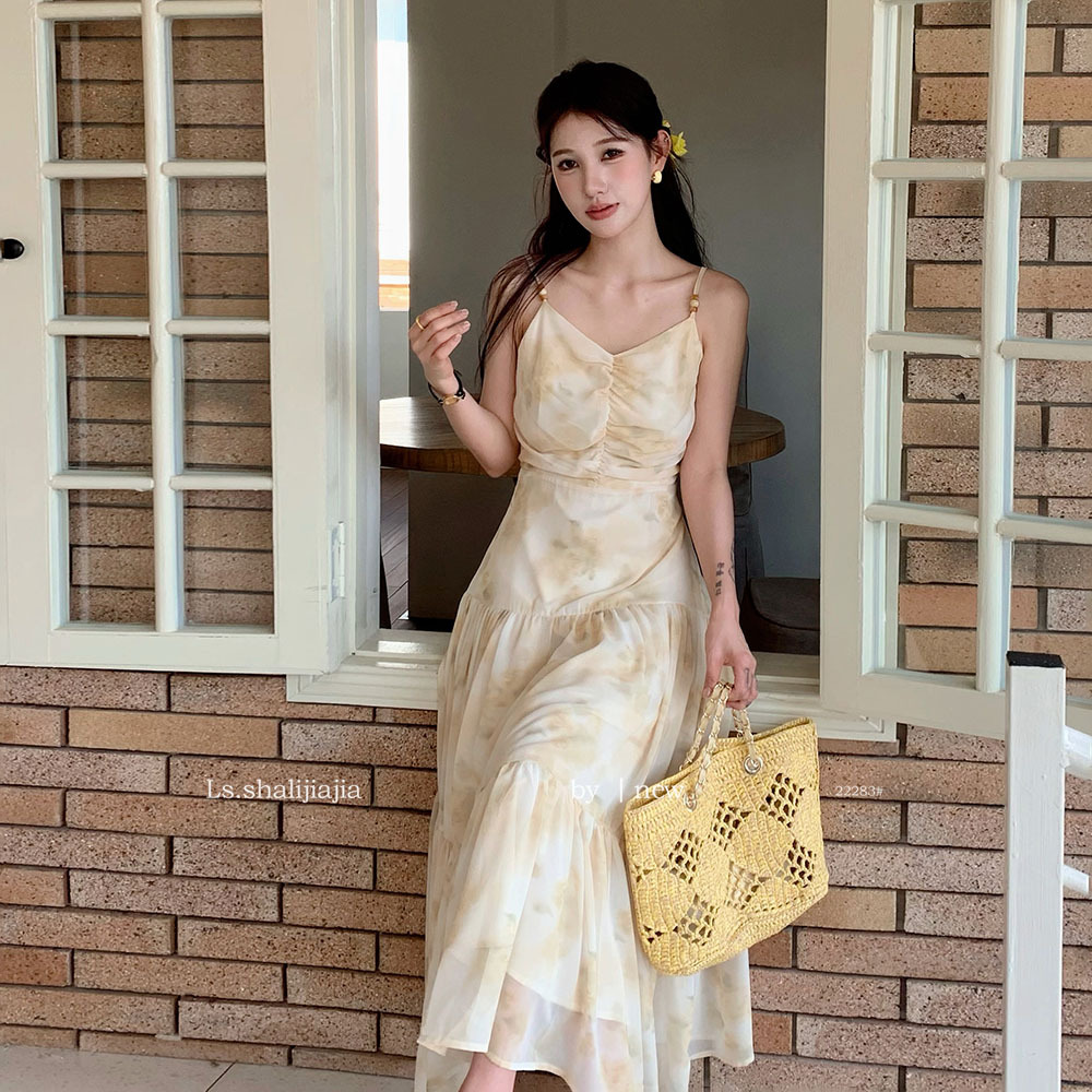 LS 수지 리조트 스타일 레트로 플리츠 신중국풍 메쉬 블루밍 브이넥 슬립 원피스 여성 신상 22283 #