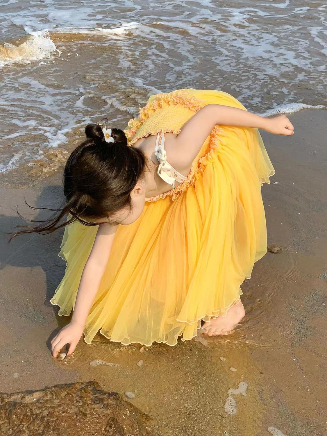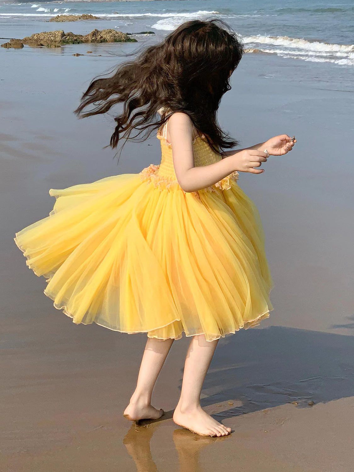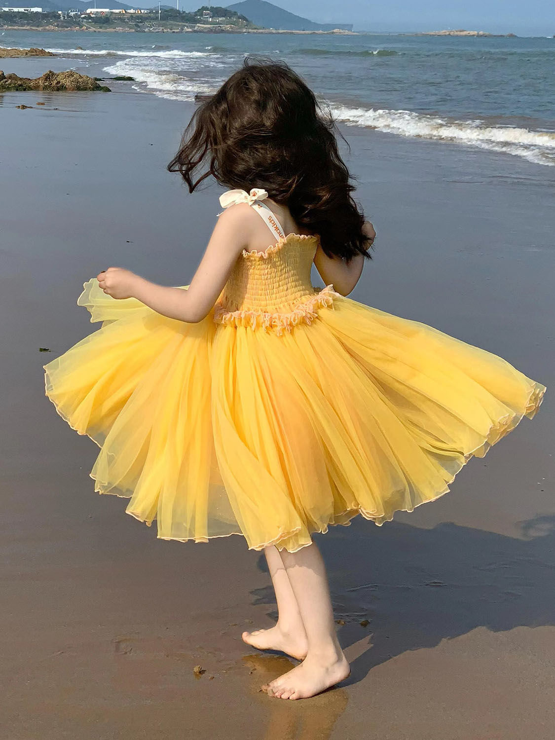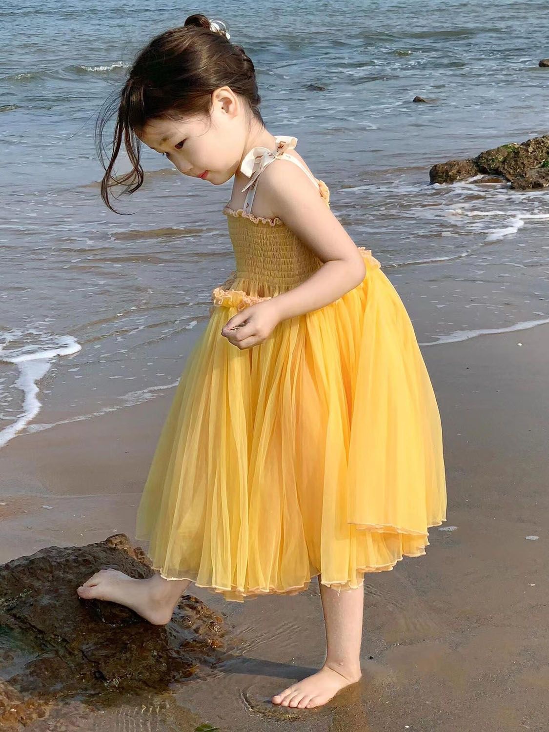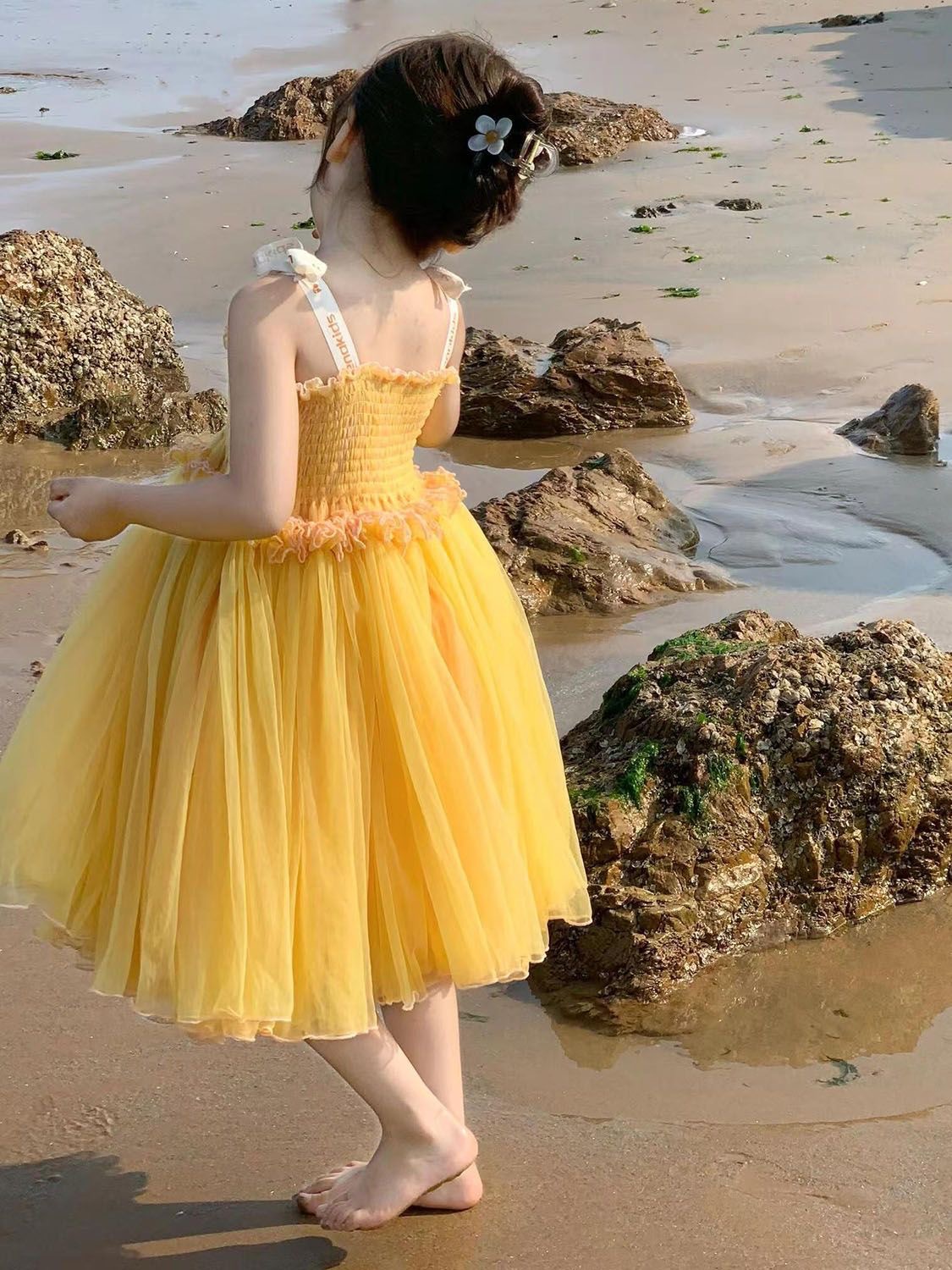 한국 아동복 2025 여름 새로운 도착 노란색 스트랩 메쉬 스커트 소녀 홀리데이 스타일 투투 프린세스 스커트스토어 가기