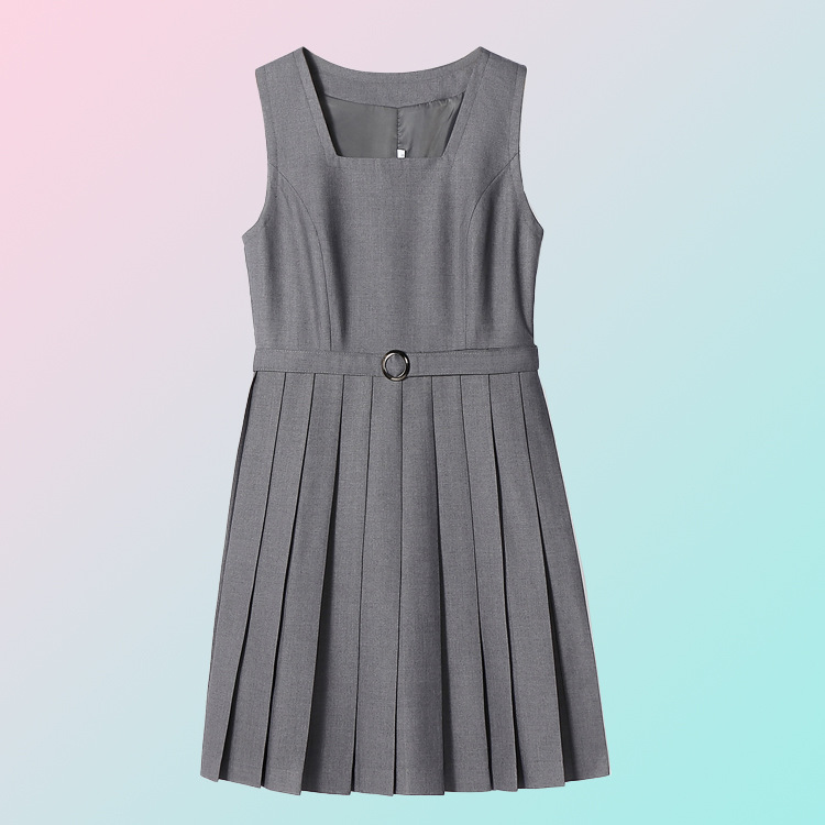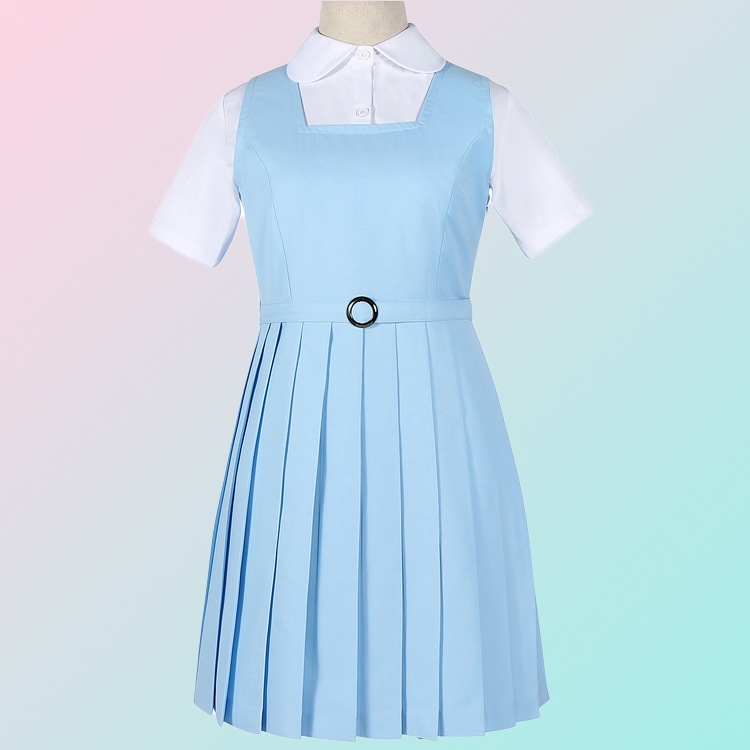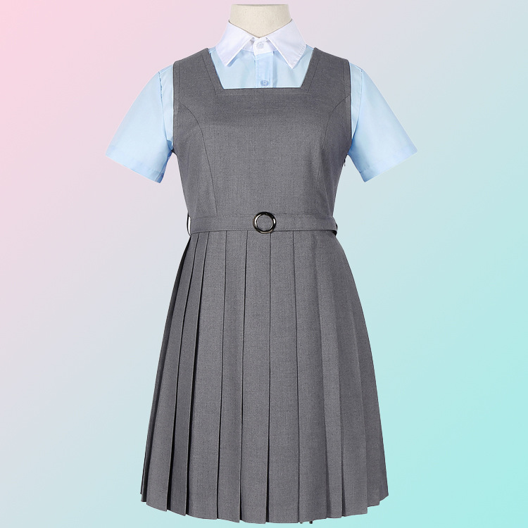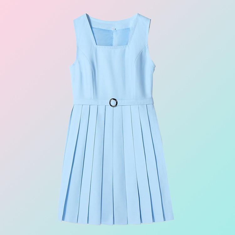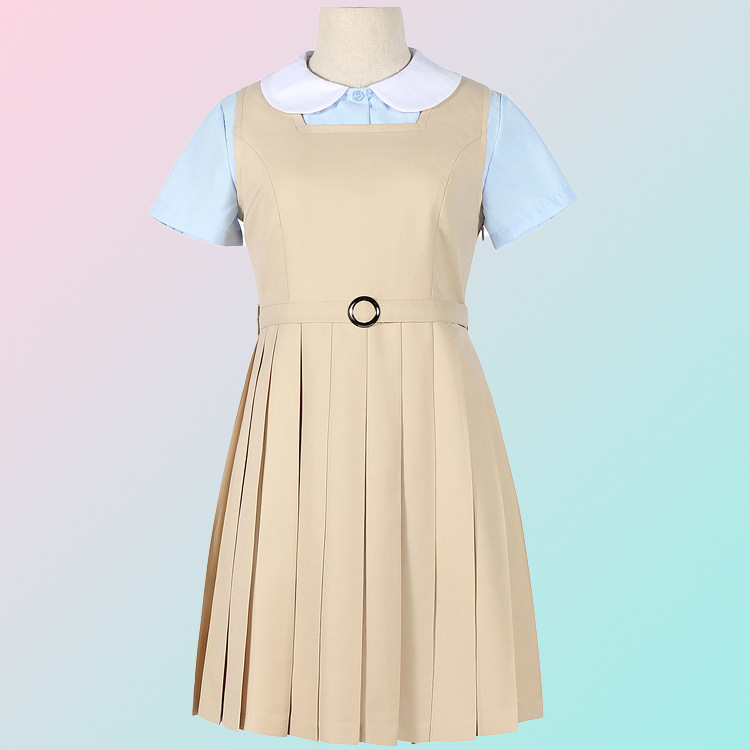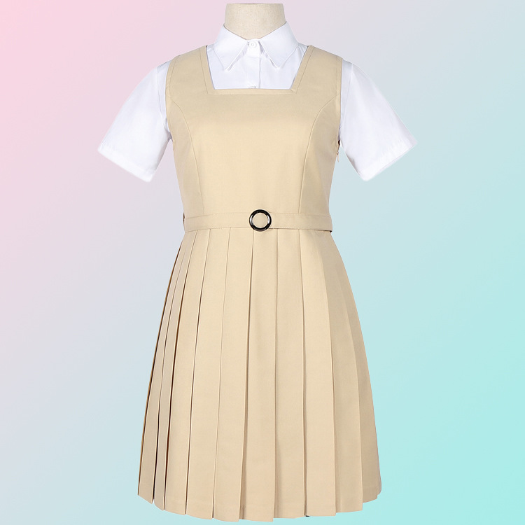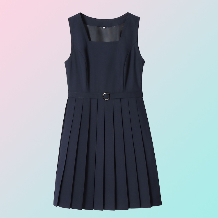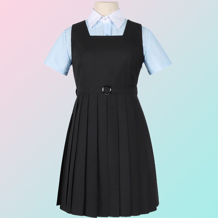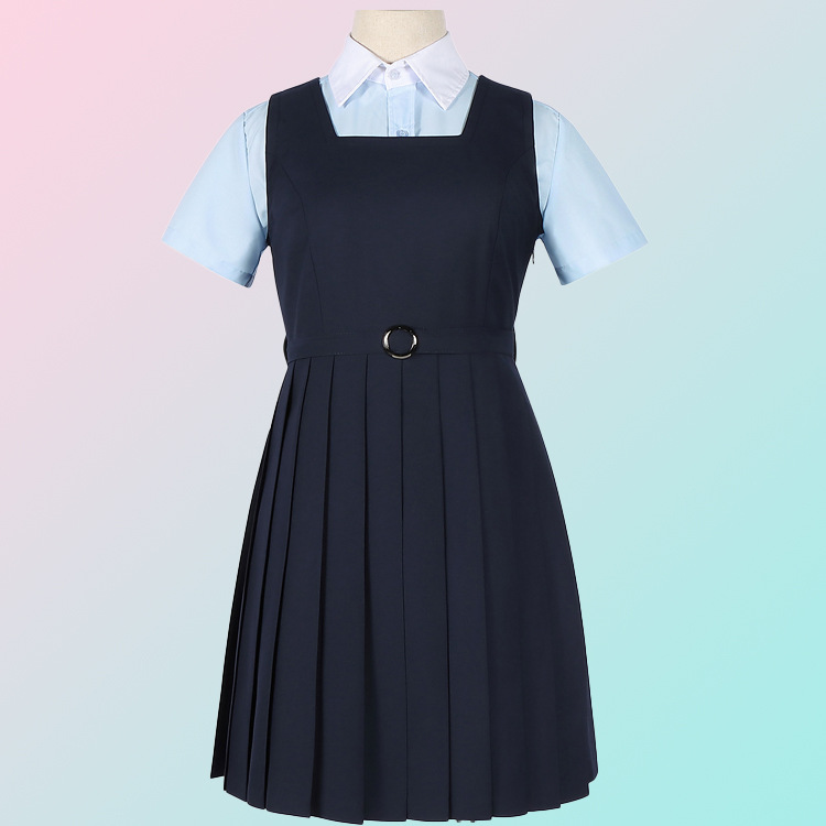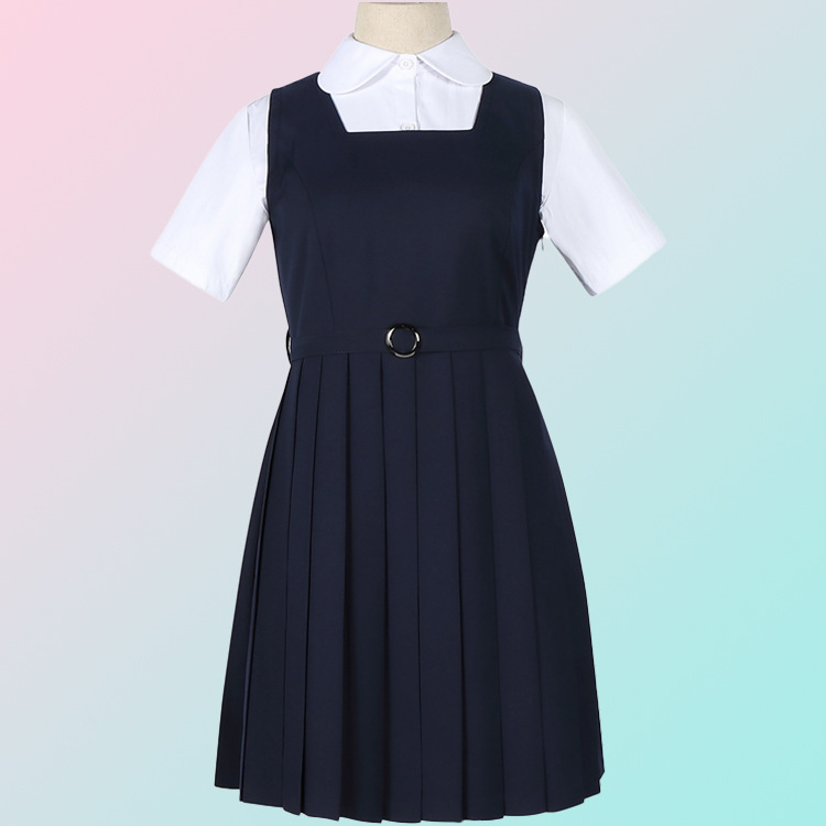 • 남색(드레스) + 여성용 흰색 라운드넥 반팔 셔츠 + 벨트