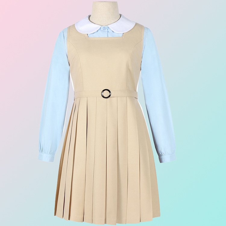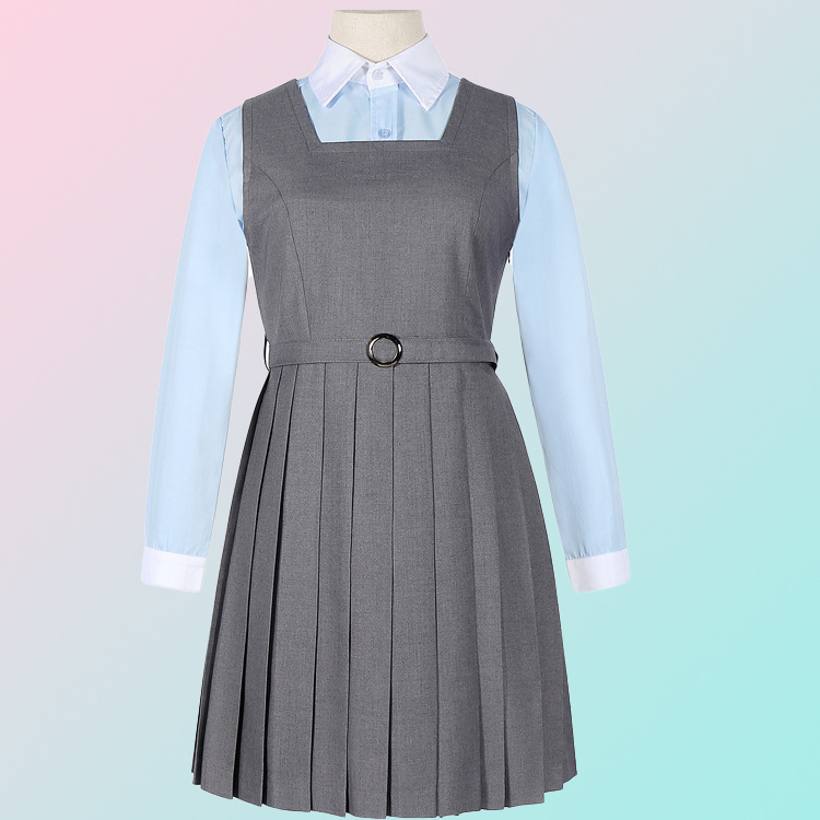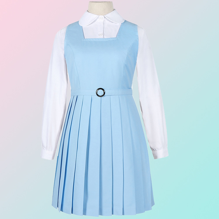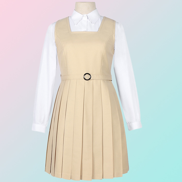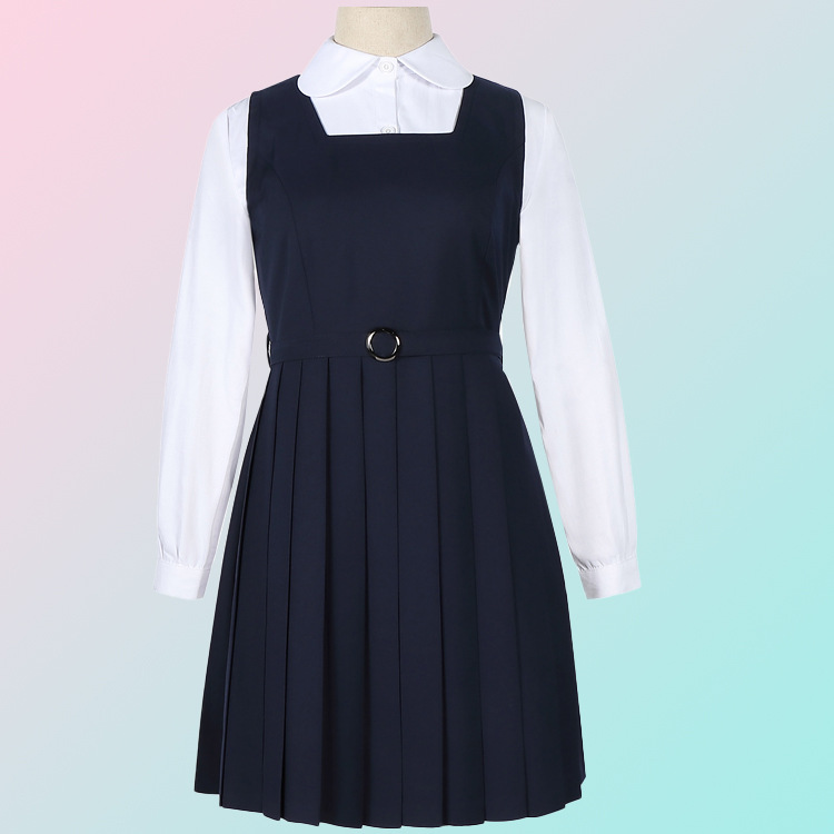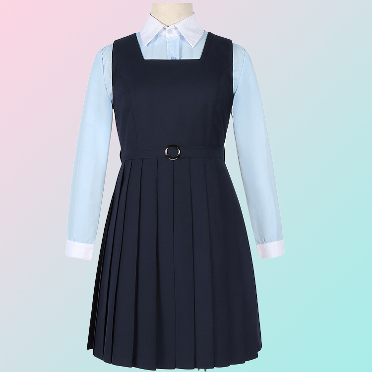 • 남색(드레스) + 여성용 흰색 라운드넥 긴팔 셔츠 + 벨트