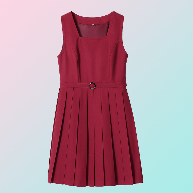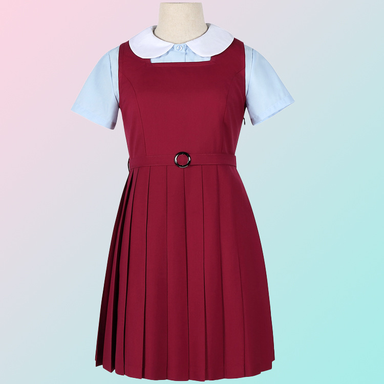 • 진한 빨간색 (드레스) + 여성용 흰색 포인트 칼라 반팔 셔츠 + 벨트