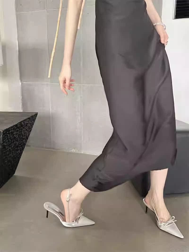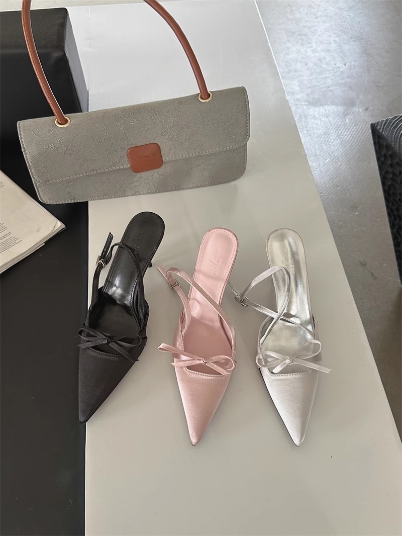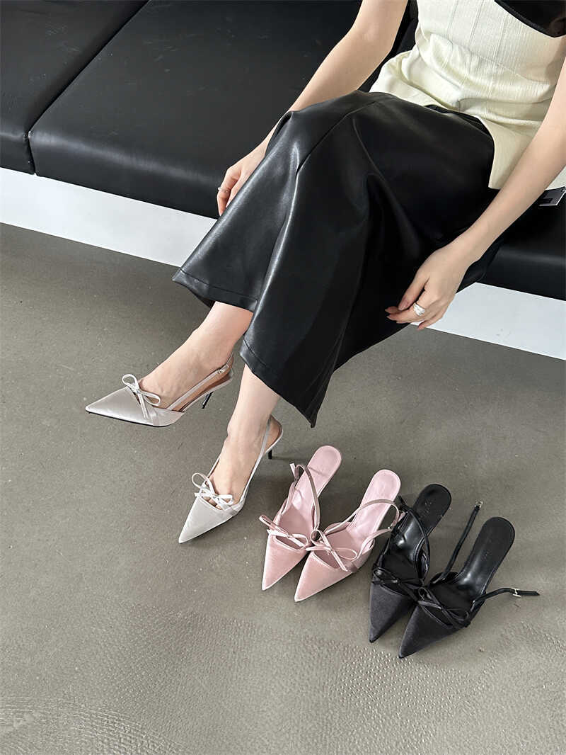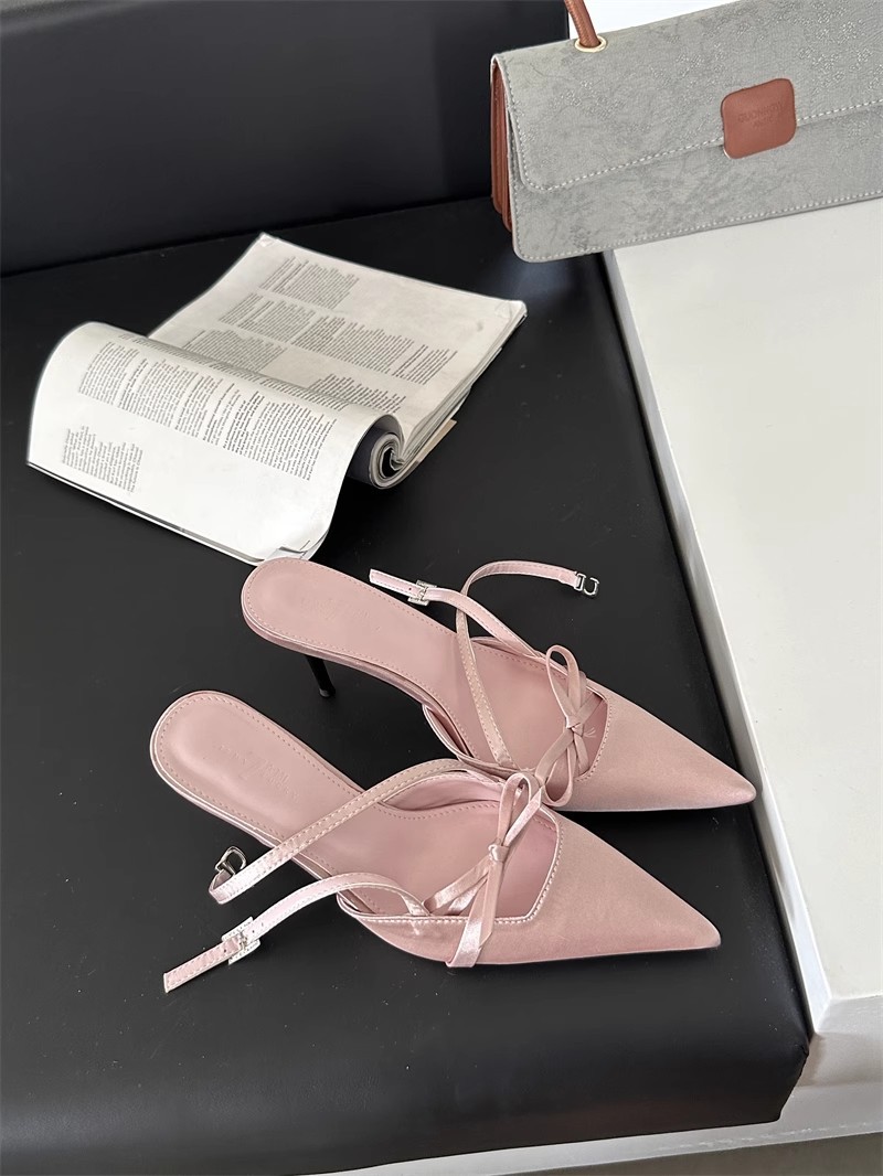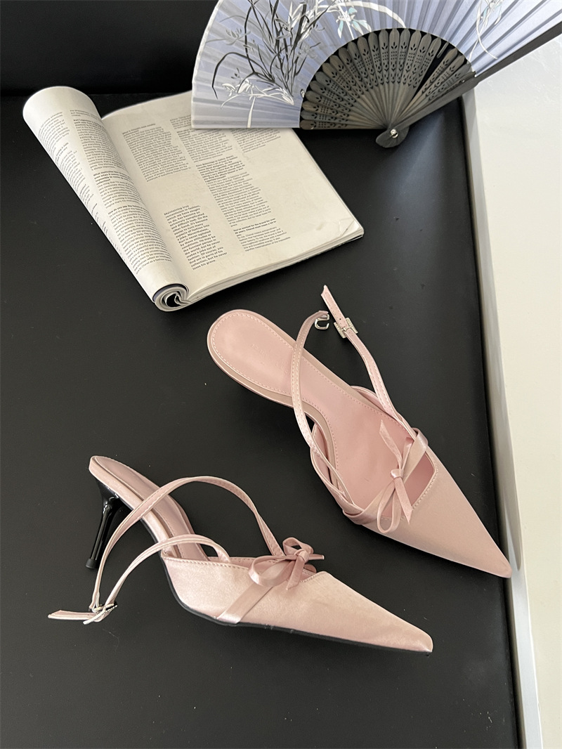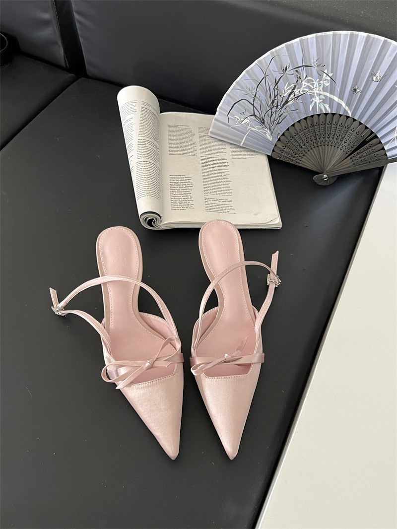 뒤가 빈 샌들, 뾰족한 앞코, 새틴 리본, 2026년 신상 여성 여름용, 원라인 버클 스트랩, 얇은 굽 하이힐스토어 가기