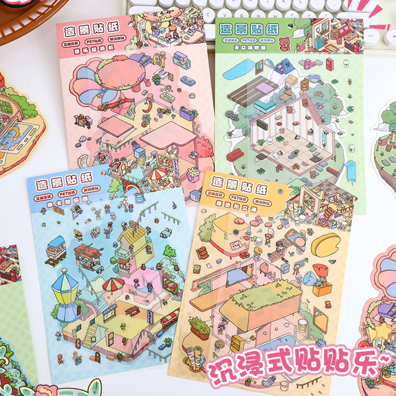 한국 스타일 귀여운 풍경 스티커 창조적 인 만화 손 계정 3D 스테레오 스토리지 마이크로 장면 콜라주 DIY 작은 스티커스토어 가기