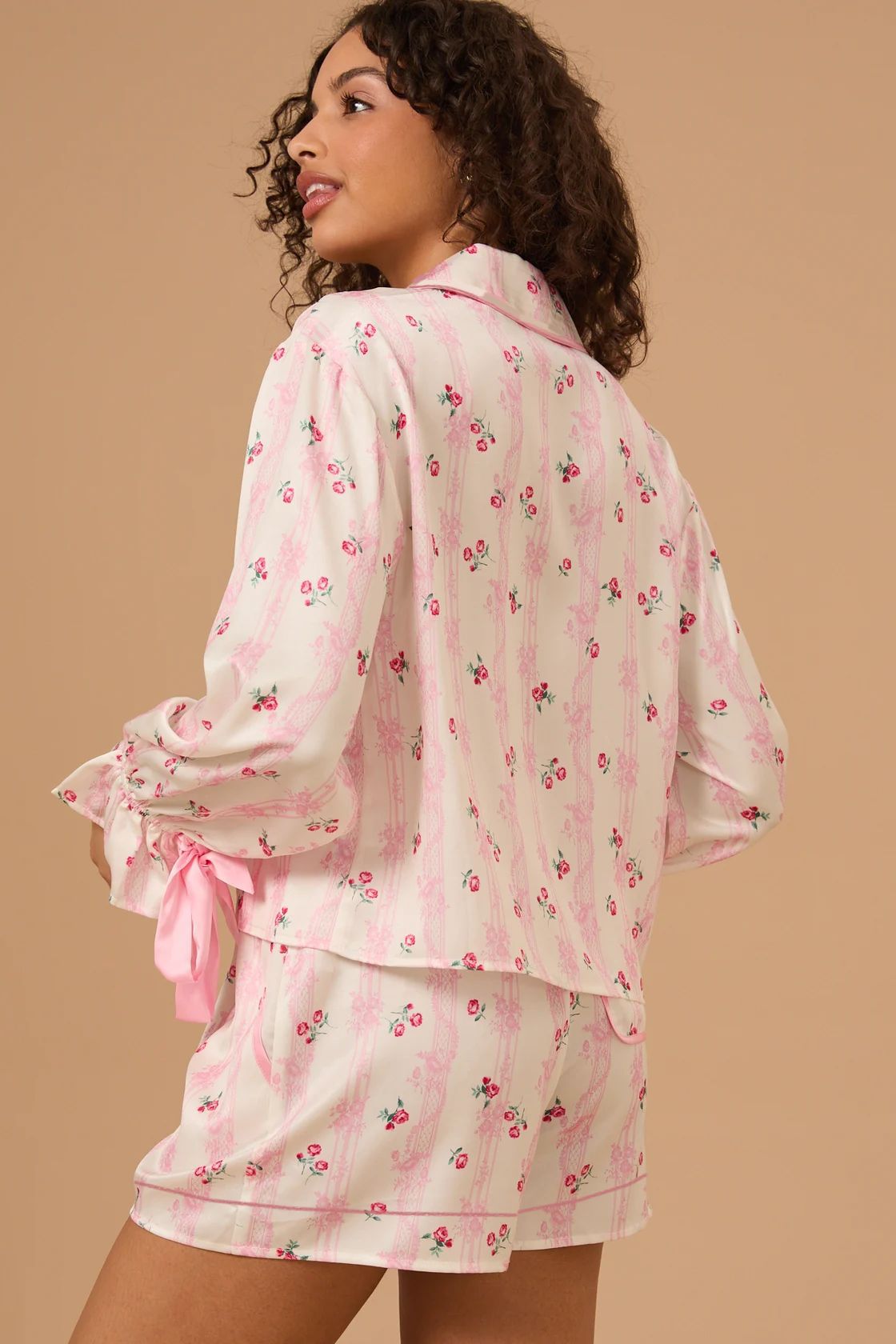달콤한 여성스러운 스타일! 리본 장식이 달린 핑크색 꽃무늬 실크 잠옷 세트, 매우 귀엽고 핑크색스토어 가기