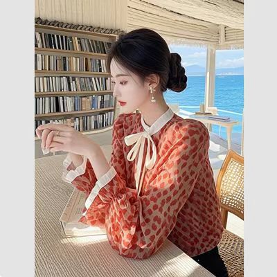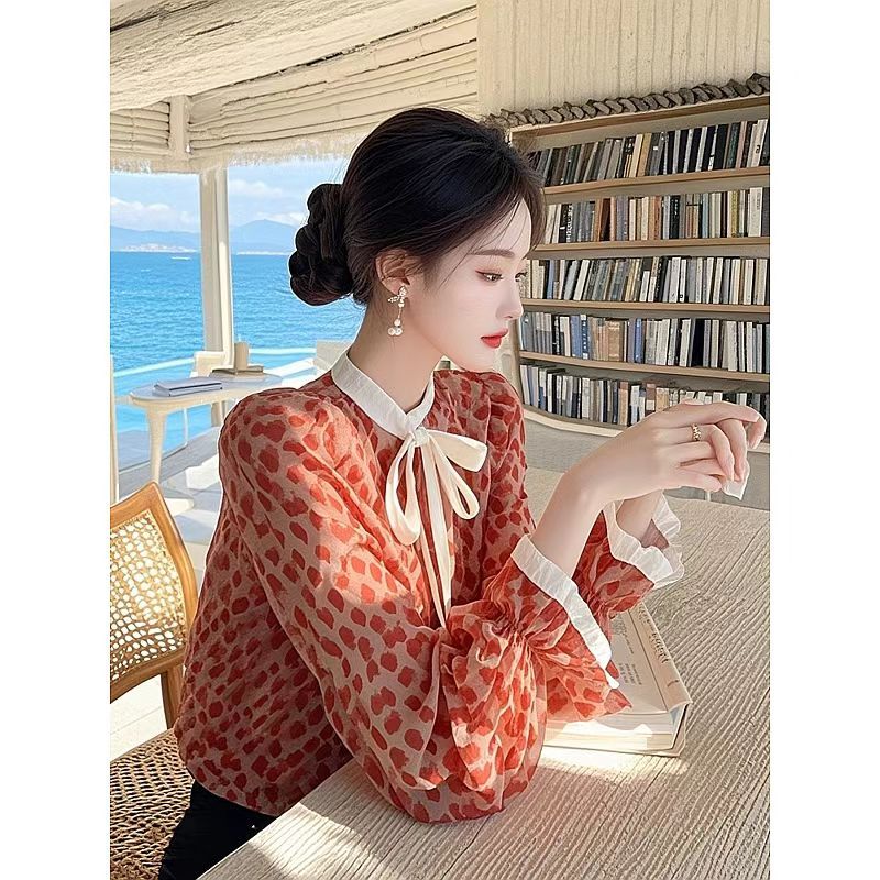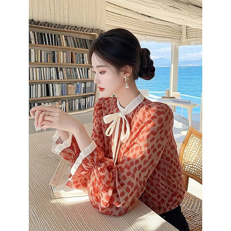 슈퍼 잘 생긴 붉은 꽃 쉬폰 셔츠 여자의 2025 년 이른 봄 새로운 게으른 스타일 프랑스 허리 트럼펫 소매 셔츠스토어 가기