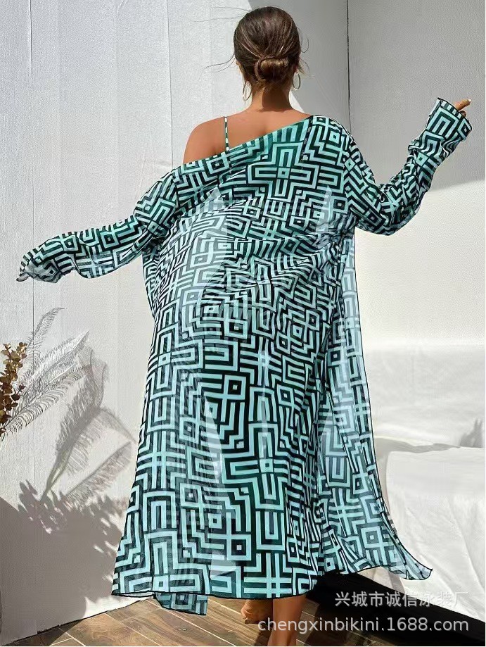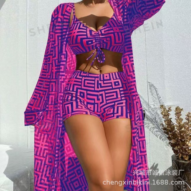 2025 새로운 유럽과 미국의 아마존 여성 스플릿 수영복 블라우스 3 피스 세트 헤더 비치 하이 허리 복서 수영