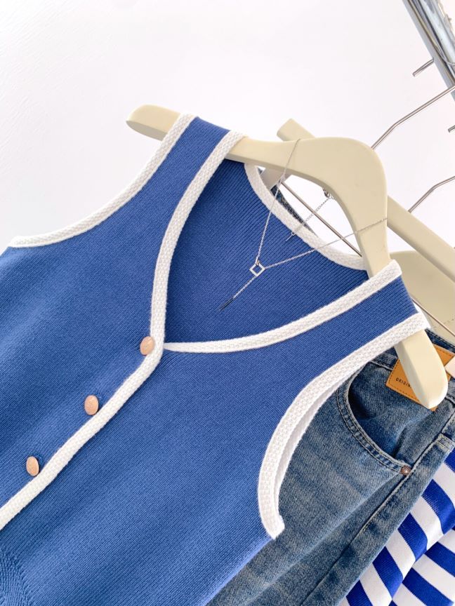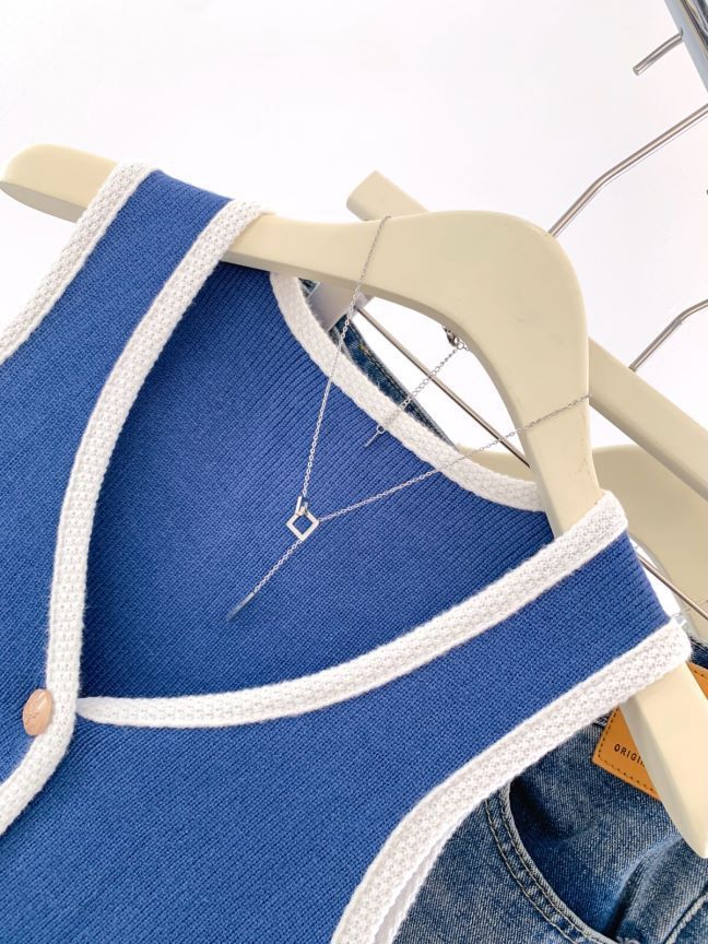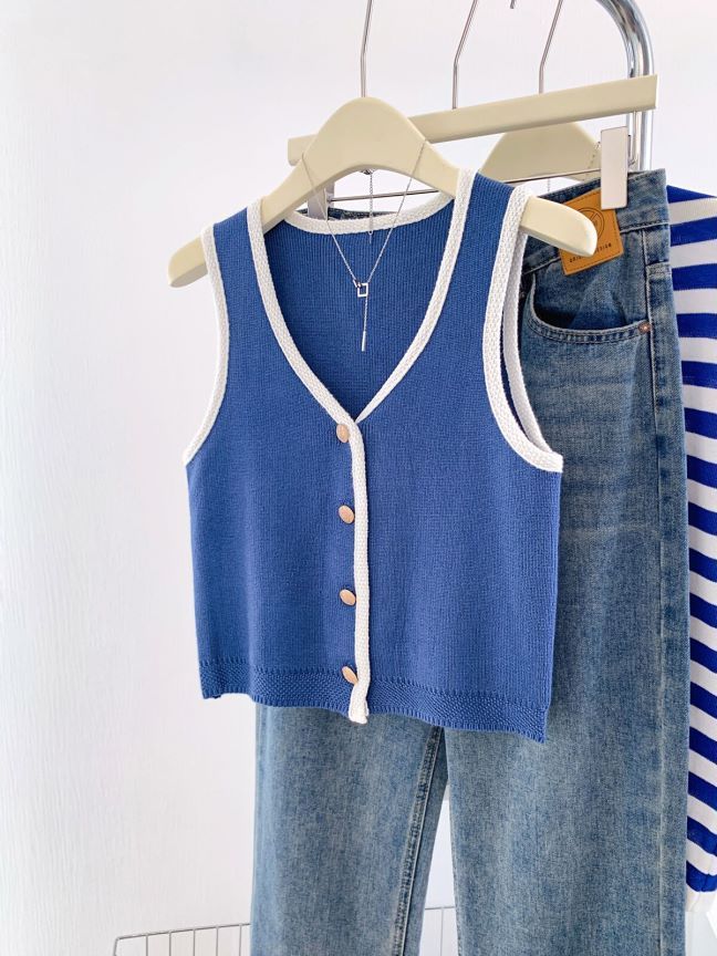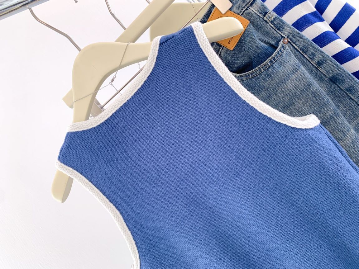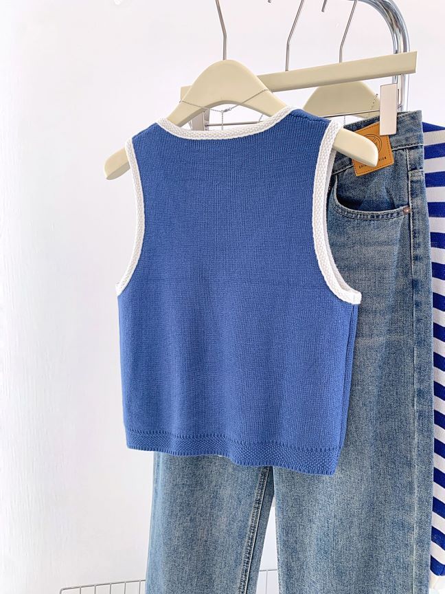 리얼 샷 ~ 콘트라스트 컬러 V 넥 민소매 니트 조끼 여성 여름 디자인 틈새 2025 연령 감소 조커 쇼트 탑스토어 가기