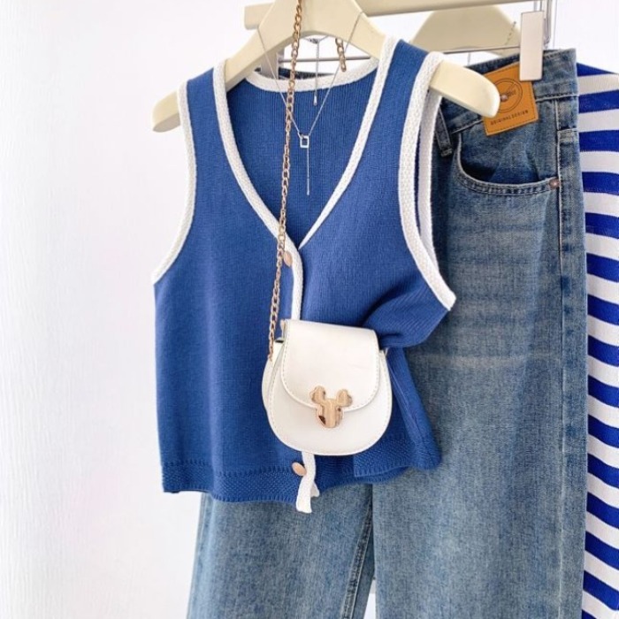 리얼 샷 ~ 콘트라스트 컬러 V 넥 민소매 니트 조끼 여성 여름 디자인 틈새 2025 연령 감소 조커 쇼트 탑