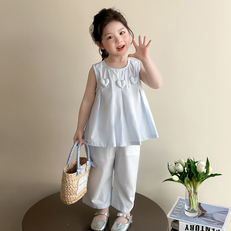소녀 여름 세트 2025 새로운 외국 스타일의 어린 소녀 그물 빨간 조끼 어린 소녀 여름 넓은 다리 바지 투피스 세트스토어 가기